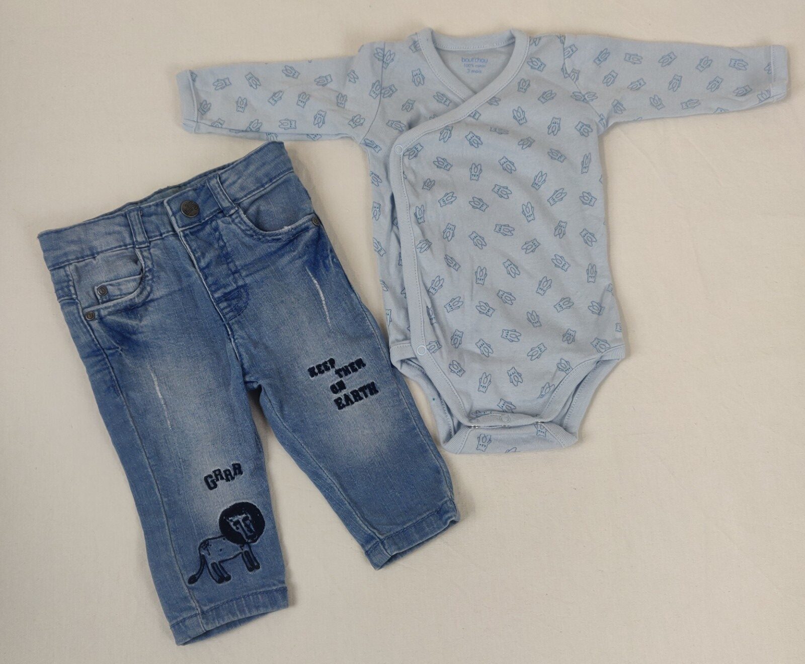 Autres commentaires : Ensemble 2 pièces. Un body à manches longues ouverture portefeuille Bout’chou – bleu. Motifs oursons. Un jean Orchestra effet used – bleu. Taille ajustable. 2 poches latérales et 2 poches arrières. Motif au bas de la jambe droite lion bleu marine accompagné de l’inscription « Keep them on earth ».