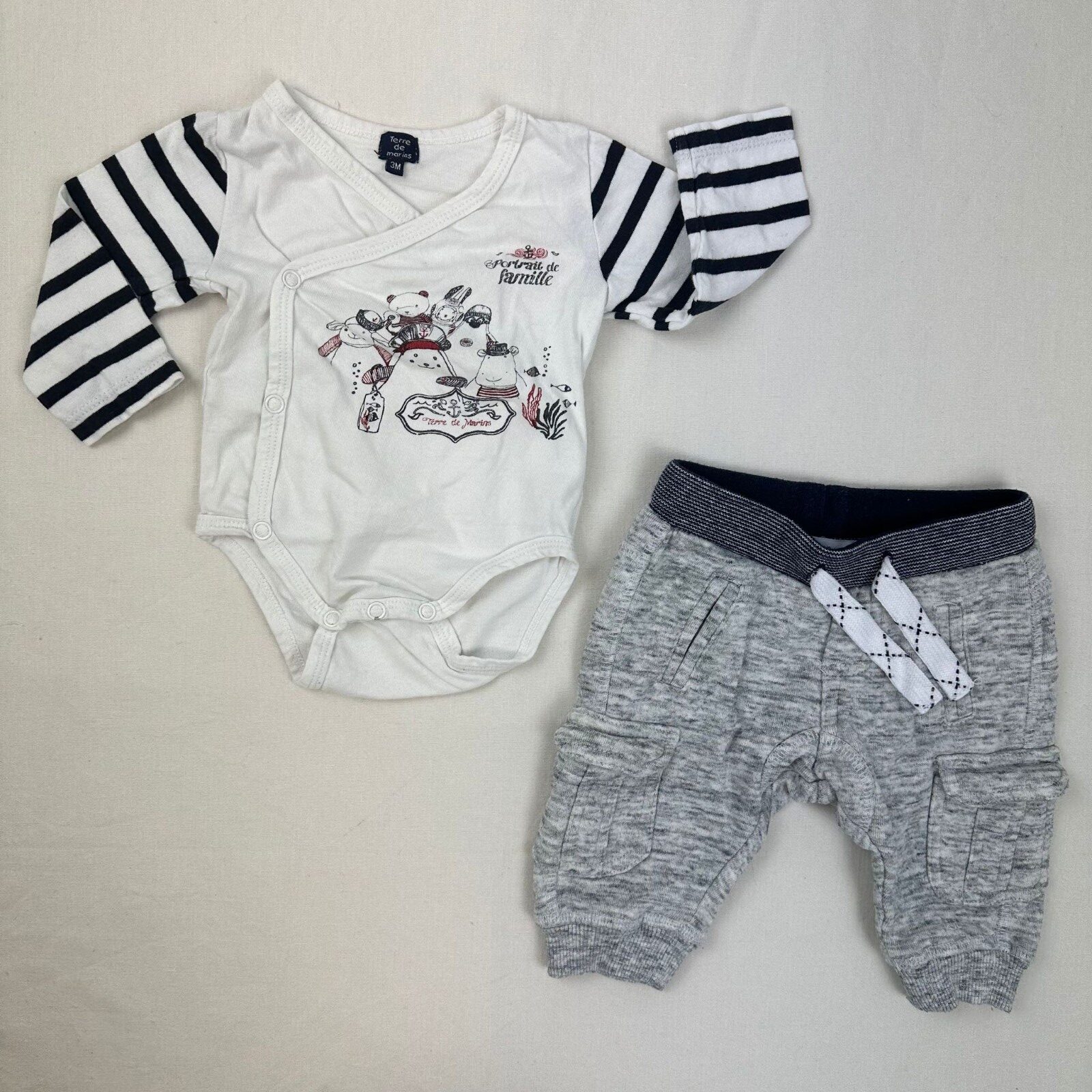 Autres commentaires : Body Terre des marins manches longues blanc avec manches bleu foncé avec une fermeture devant par boutons pressions. Pantalon jogging gris Gemo avec taille élastiquée.