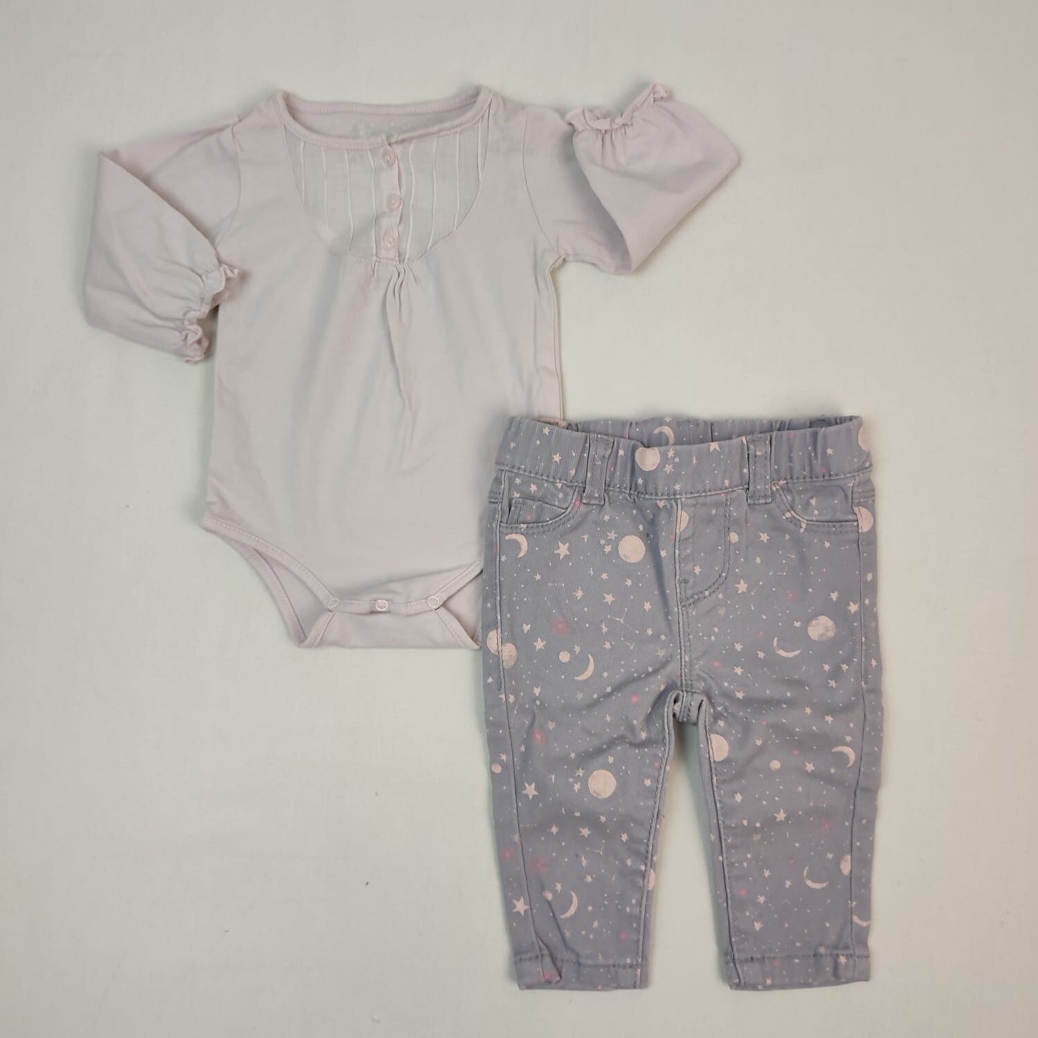 Autres commentaires : Ensemble 2 pièces : – Body manches longues rose pâle BOUT’CHOU, poignets élastiqués et volantés, 97% coton et 3% elasthanne, fermeture par mini boutons à l’avant. – Pantalon rose et gris de PRIMARK, motifs étoiles, lune et soleil, taille élastiquée.