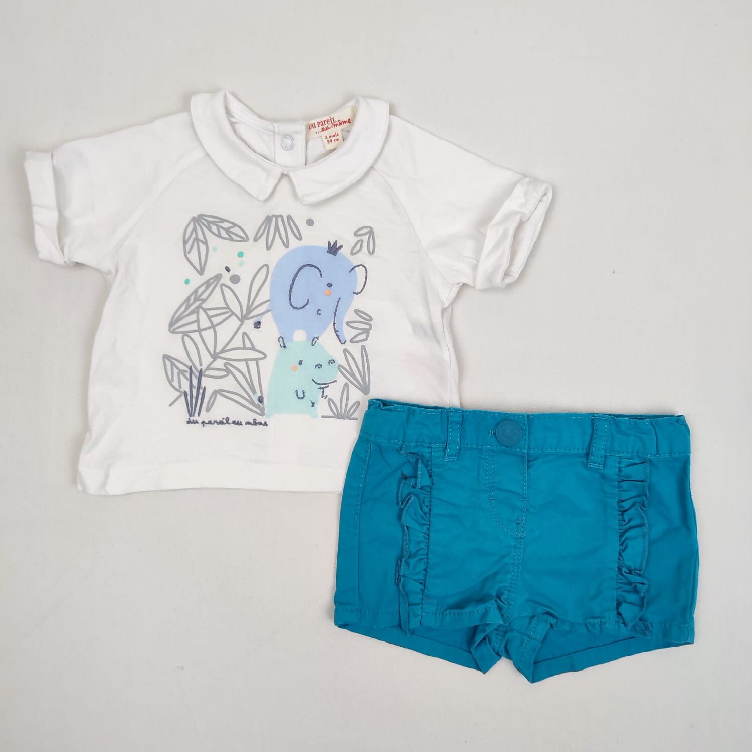 Autres commentaires : Ensemble 2 pièces : – T-shirt blanc Du Pareil Au Même à manches courtes avec revers, motif éléphant bleu et hippopotame vert clair au milieu de feuillages gris, col claudine, fermeture par boutons pression au dos. – Short en toile bleu canard In Extenso, volant latéral, ceinture ajustable par élastique intérieur, fermeture devant par crochet métallique.