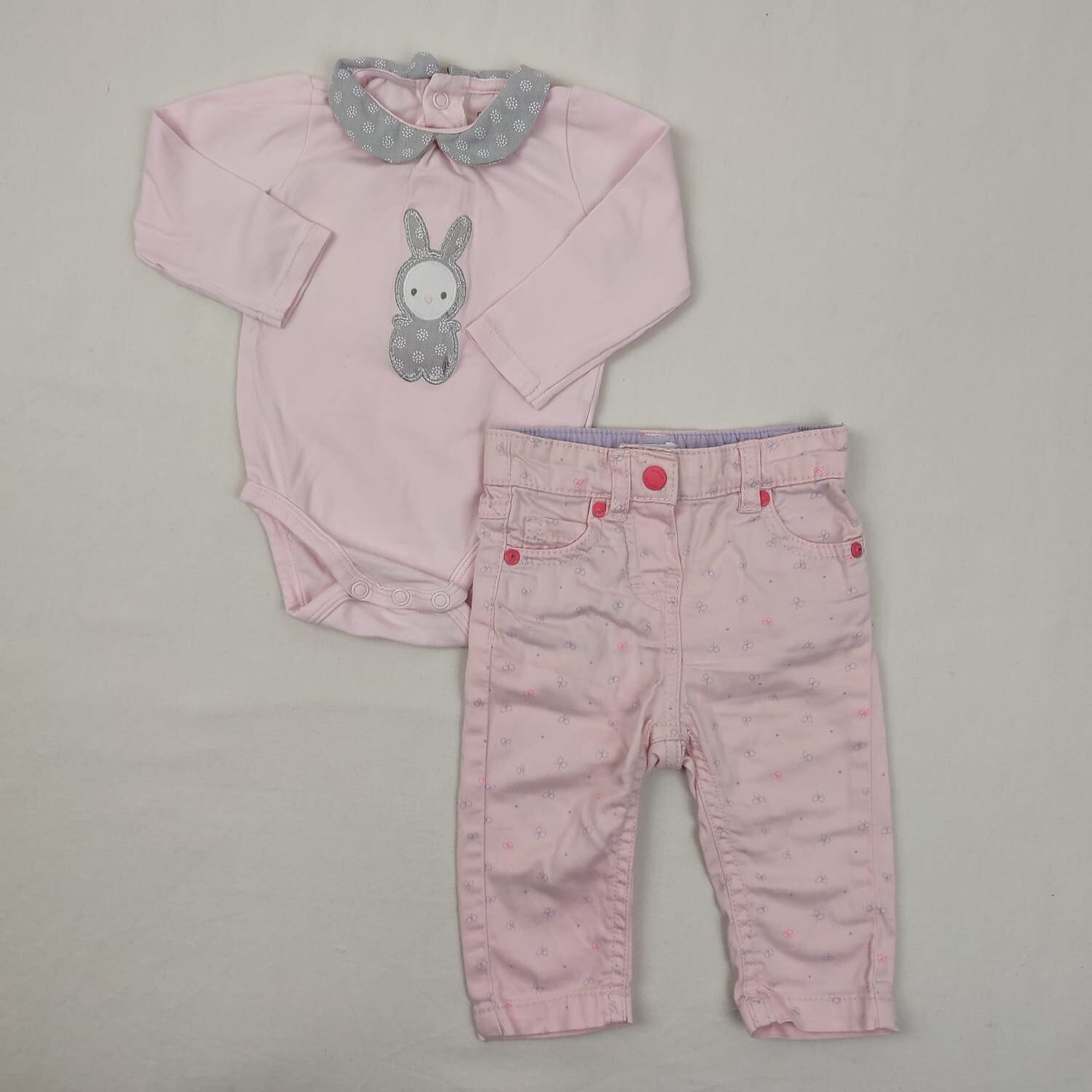 Autres commentaires : Ensemble 2 pièces : – Body OBAIBI rose pâle à manches longues, devant motif lapin gris, col claudine gris, fermeture par boutons pression au dos. – Pantalon BRIOCHE rose pâle, motifs petits noeuds, fermeture devant par bouton pression, taille élastiquée, 2% élasthanne.