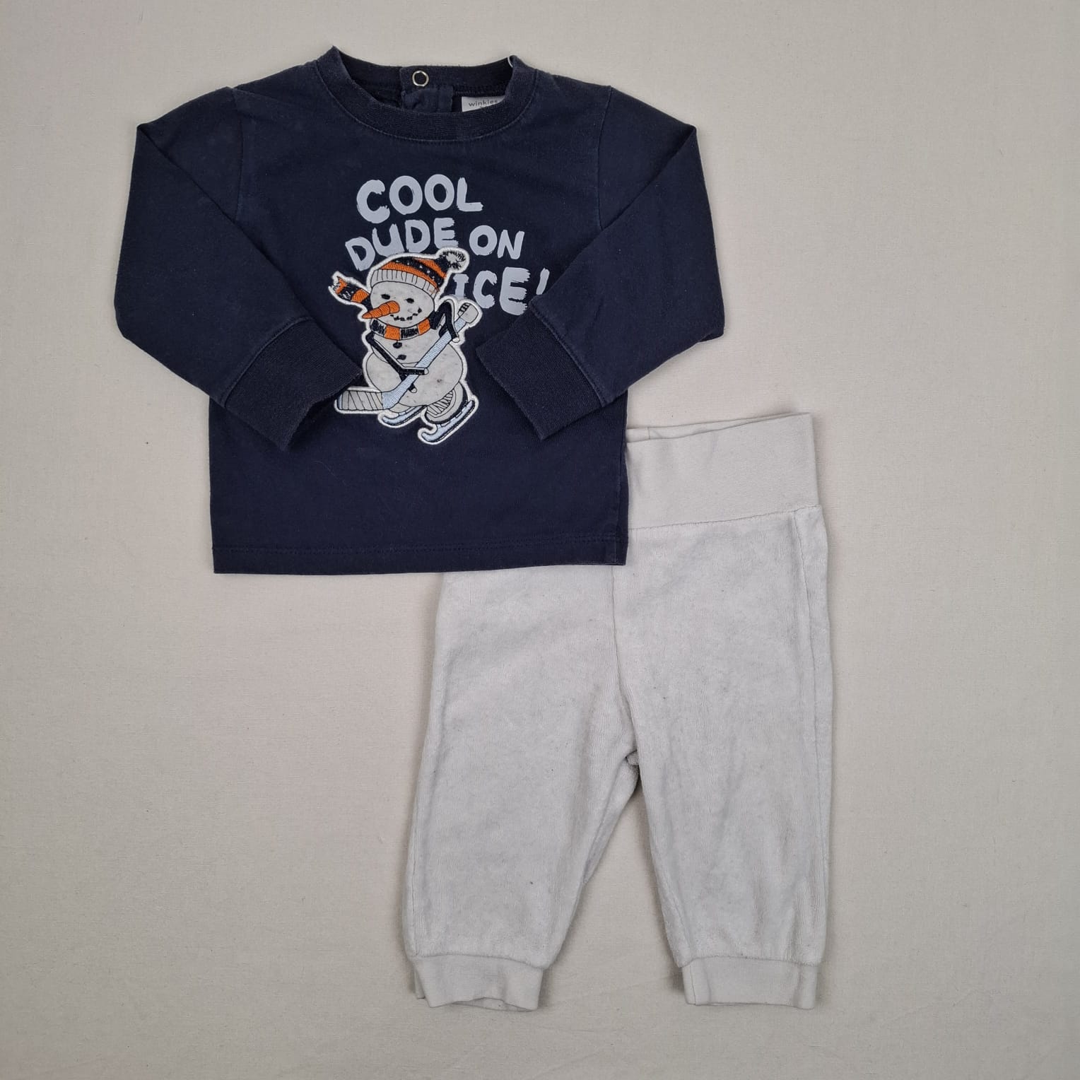 Autres commentaires : Ensemble 2 pièce: – T-shirt bleu foncé, winkies, 3mois, col rond avec des boutons pression à l’arrière du vêtement pour ouvrir le col, illustration bonhomme de neige et inscription » COOL DUDE ON ICE » à l’avant du vêtement – Pantalon blanc épais, taille élastiqué, de Boite à Malice.