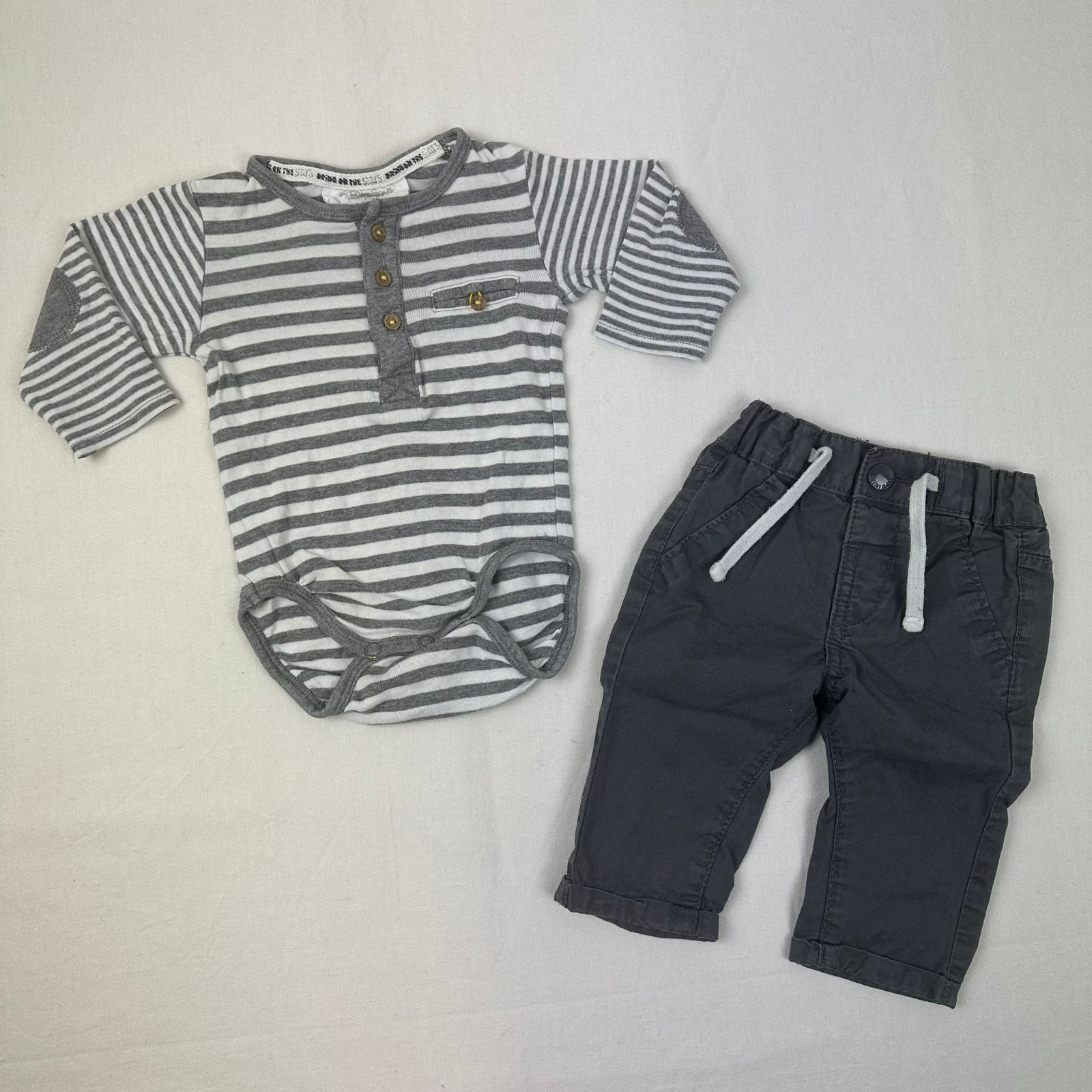 Autres commentaires : Coton organique. Body H&M manches longues gris avec rayures blanches et une fermeture au col par boutons. Pantalon kiabi gris foncé avec taille élastiquée et ceinturée.