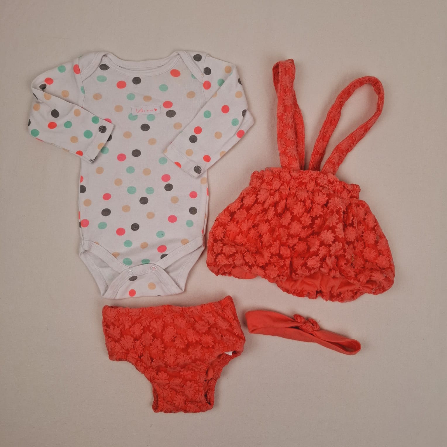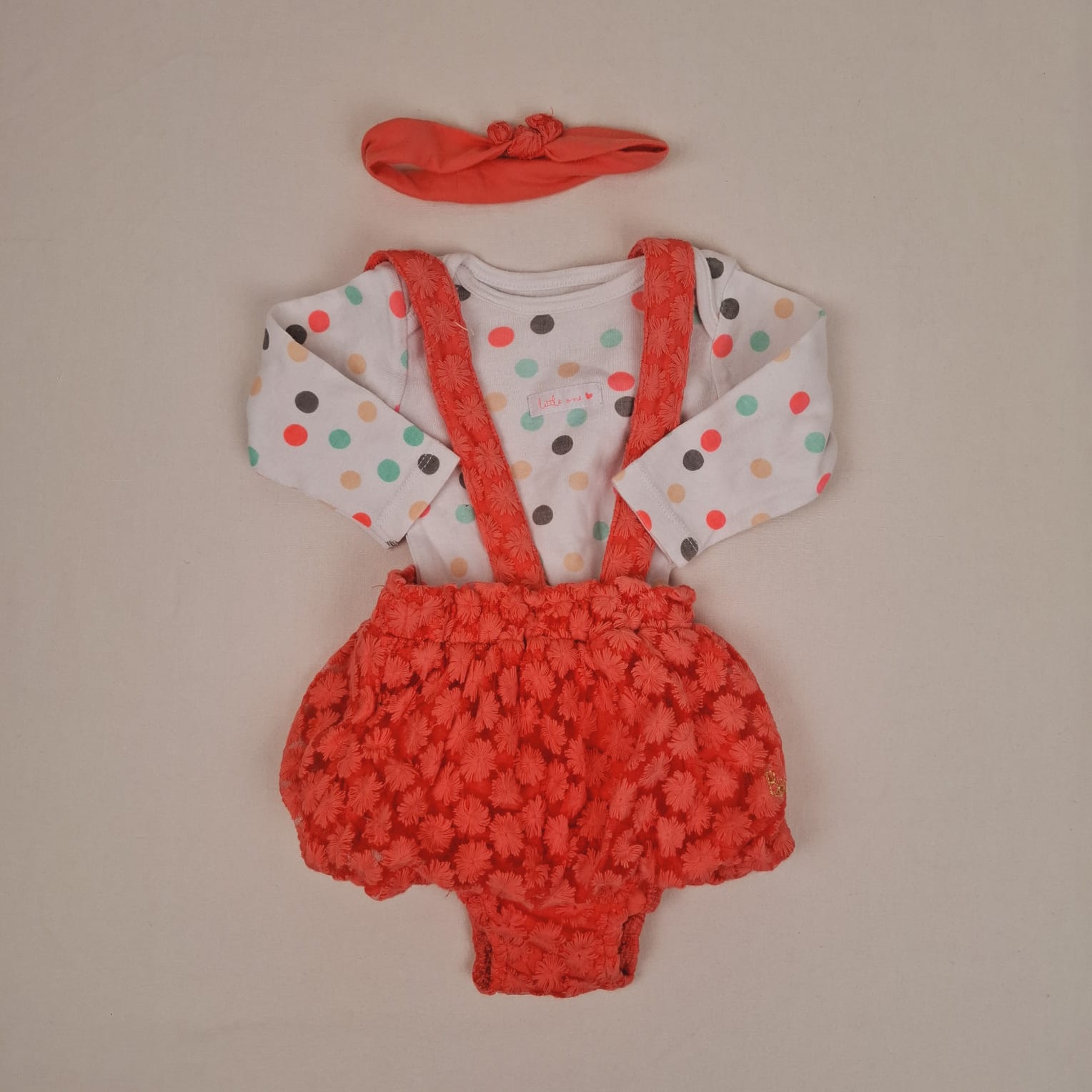 Autres commentaires : Ensemble 2 pièces 3M composé d’un body blanc à poids colorés cool club avec fermeture boutons pressions en bas et d’un lot de 3 articles dysney baby rose à motifs de fleurs avec une jupe à bretelles taille élastiquée une culotte et un noeud rose