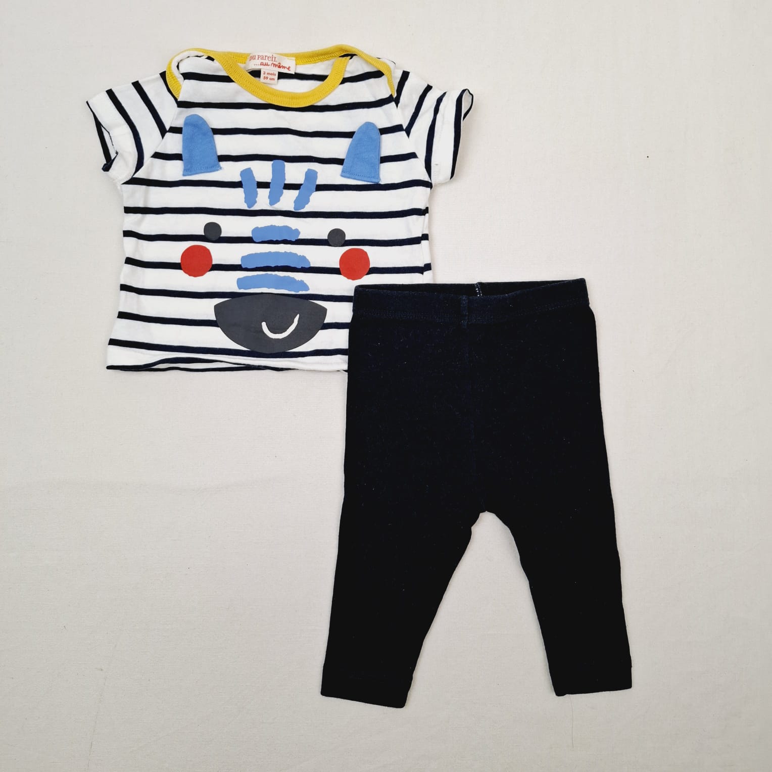Autres commentaires : Ensemble t-shirt du pareil au meme blanc, avec des rayure bleu foncé, motif visage d’une girafe, legging petit bateau bleu foncé, 100% Coton.