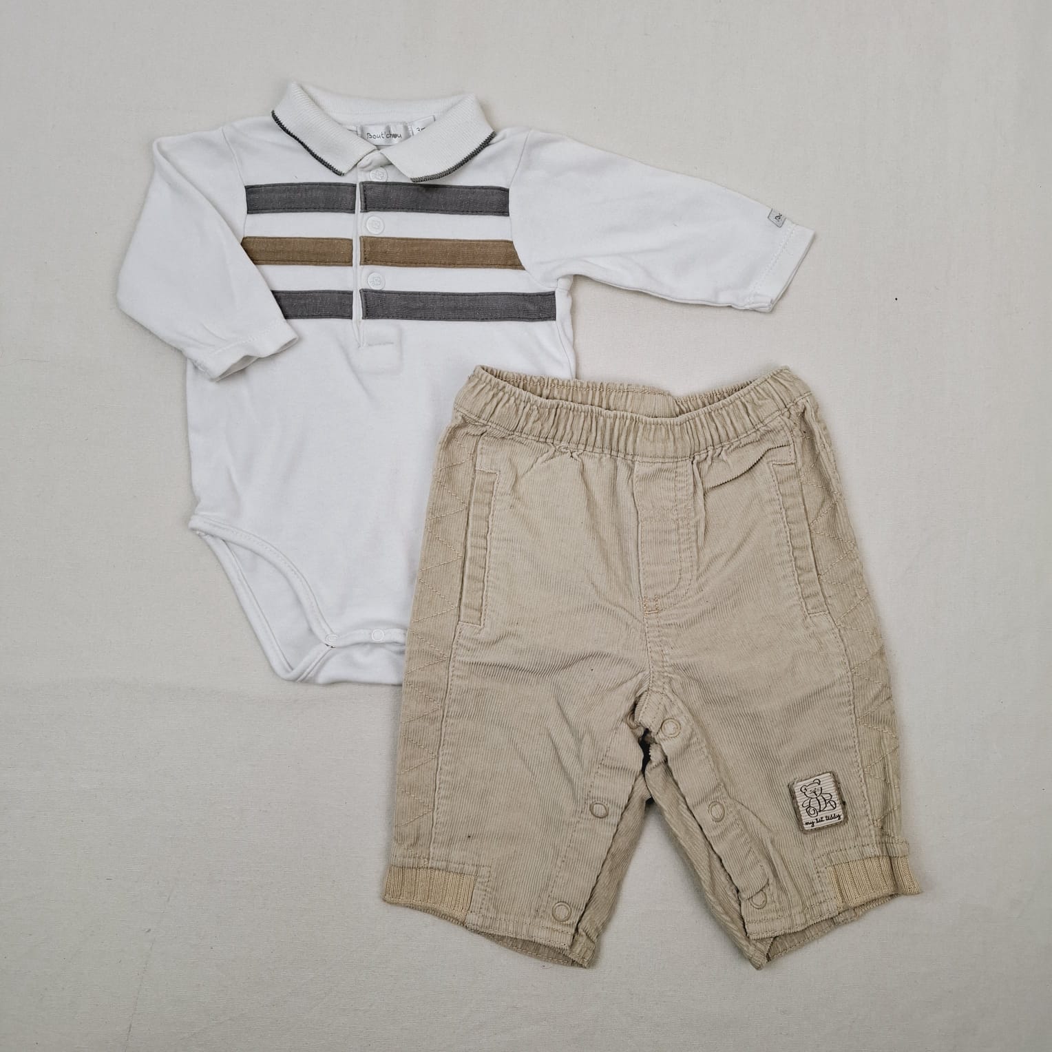 Autres commentaires : Ensemble 2 pièces: – Body blanc Bout’chou à manches longues, col polo, 3 rayures sur le devant (2 grises, 1 beige). – Pantalon Carter’s beige côtelé, taille élastique, fermeture par boutons pression à l’entre jambes .