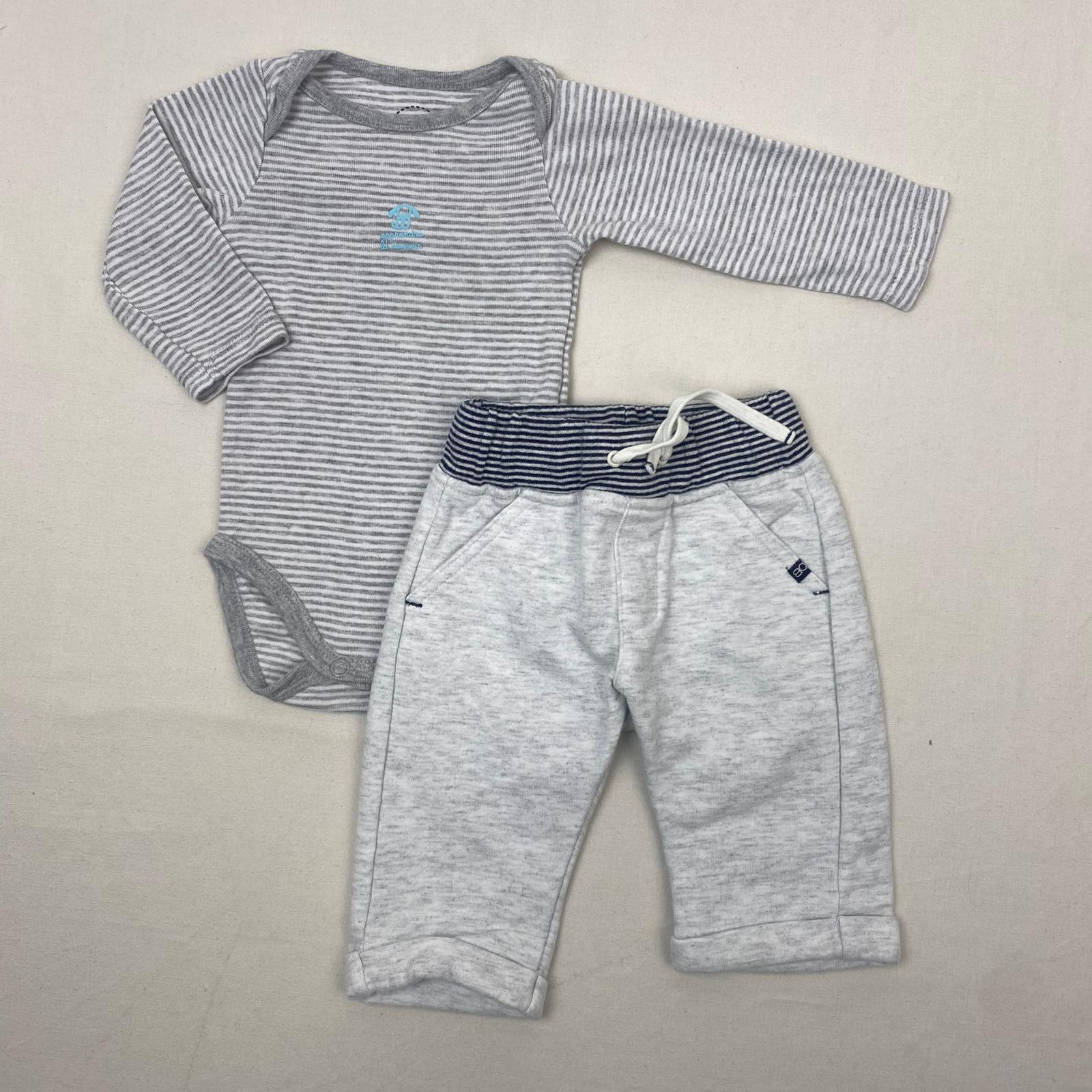 Autres commentaires : Ensemble : – Pantalon gris grège, taille élastiquée à rayures blanches et bleu marine avec cordons, 80% coton et 20% polyester. – Body manches longues à rayures grises et blanches, devant logo bleu ciel avec inscription « Apprendre en douceur », 95 % coton et 5% viscose, contient du coton bio.