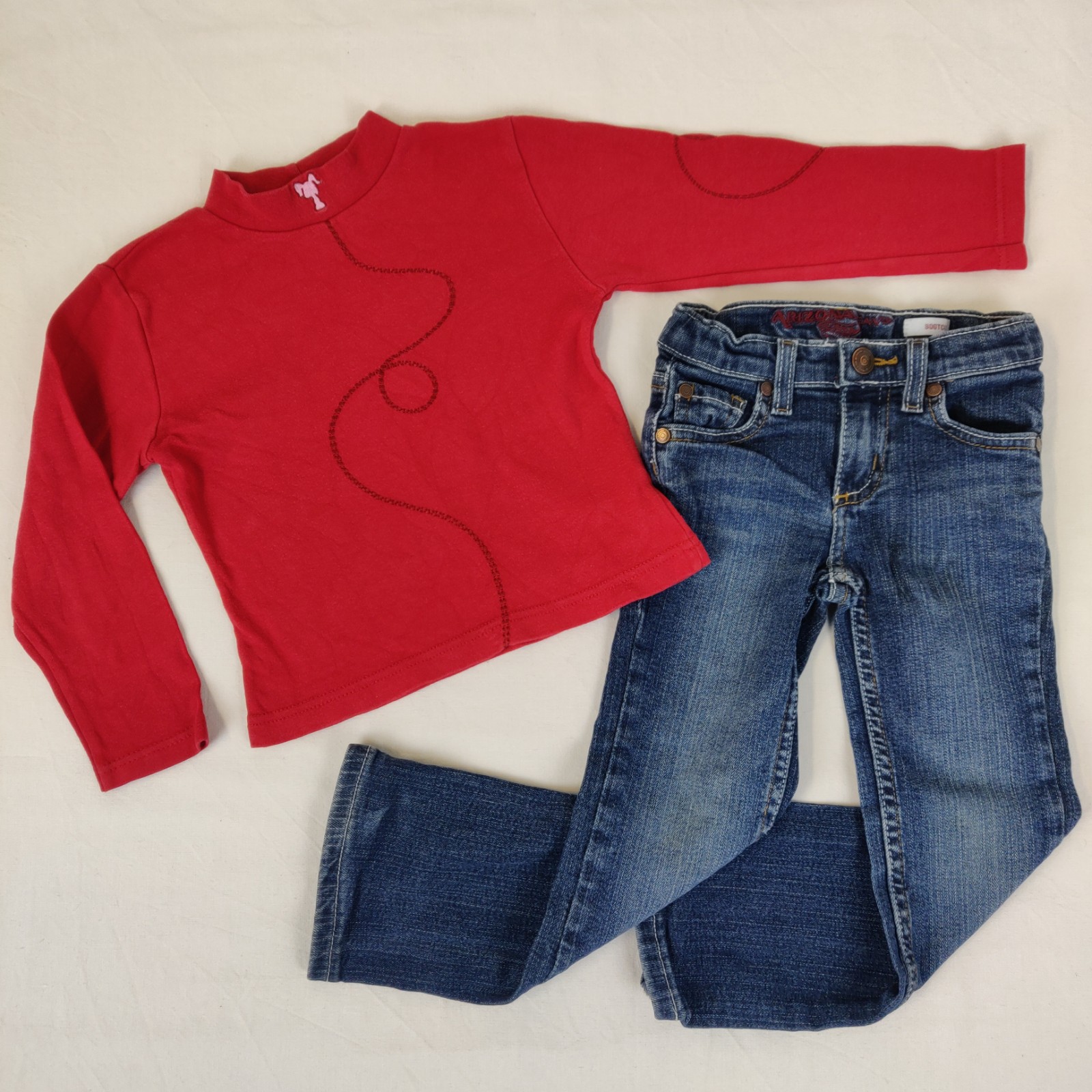 Autres commentaires : T-shirt Tissaia manches longues rouge col chéminée,Coton 100%. Jean bleu avec taille élastiquée et ceinturée,Coton 99% 1%elasthanne.