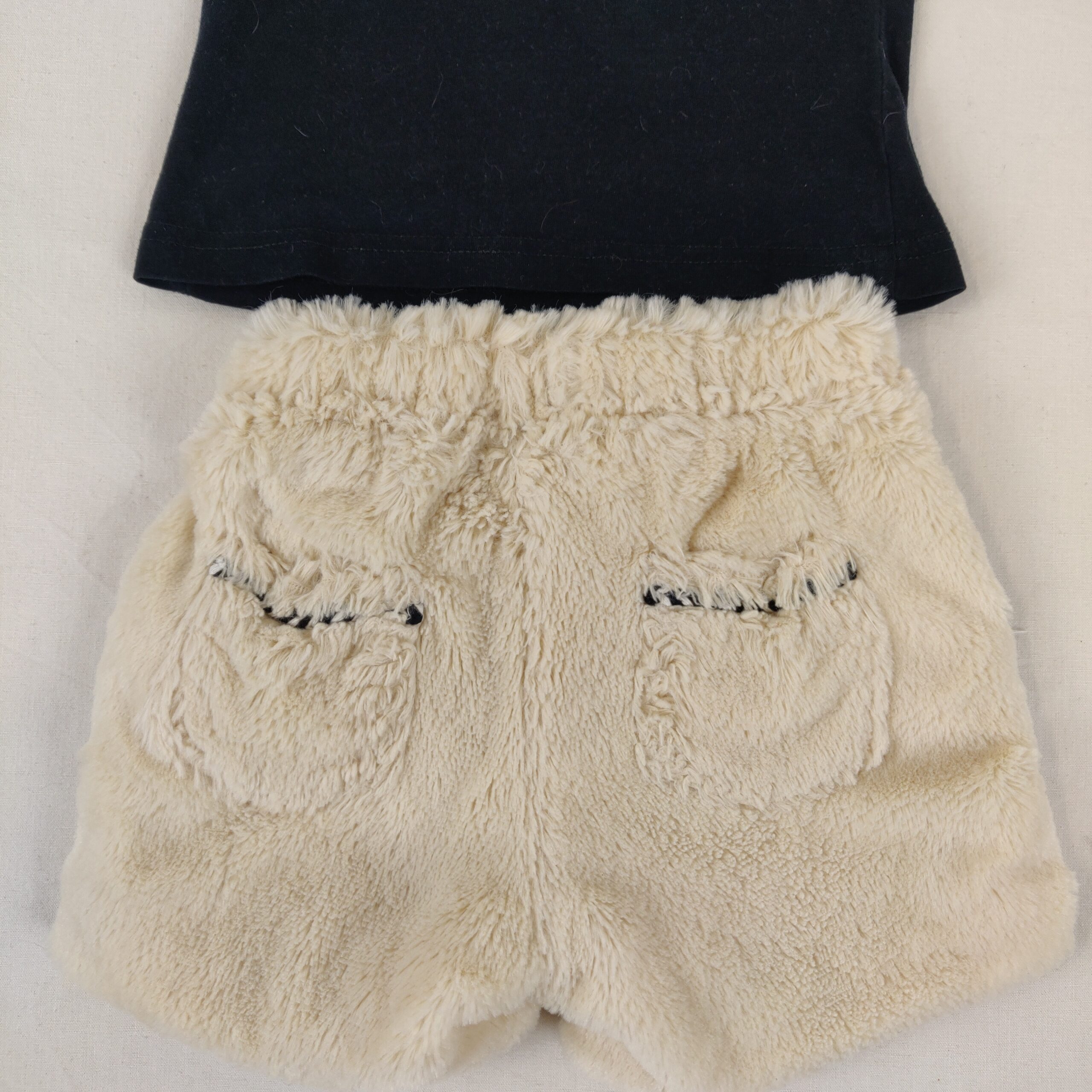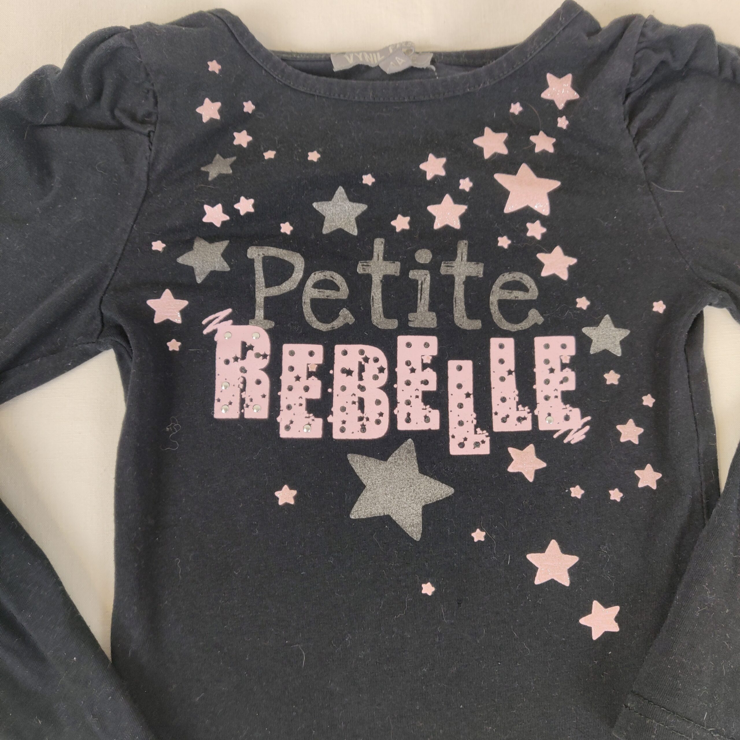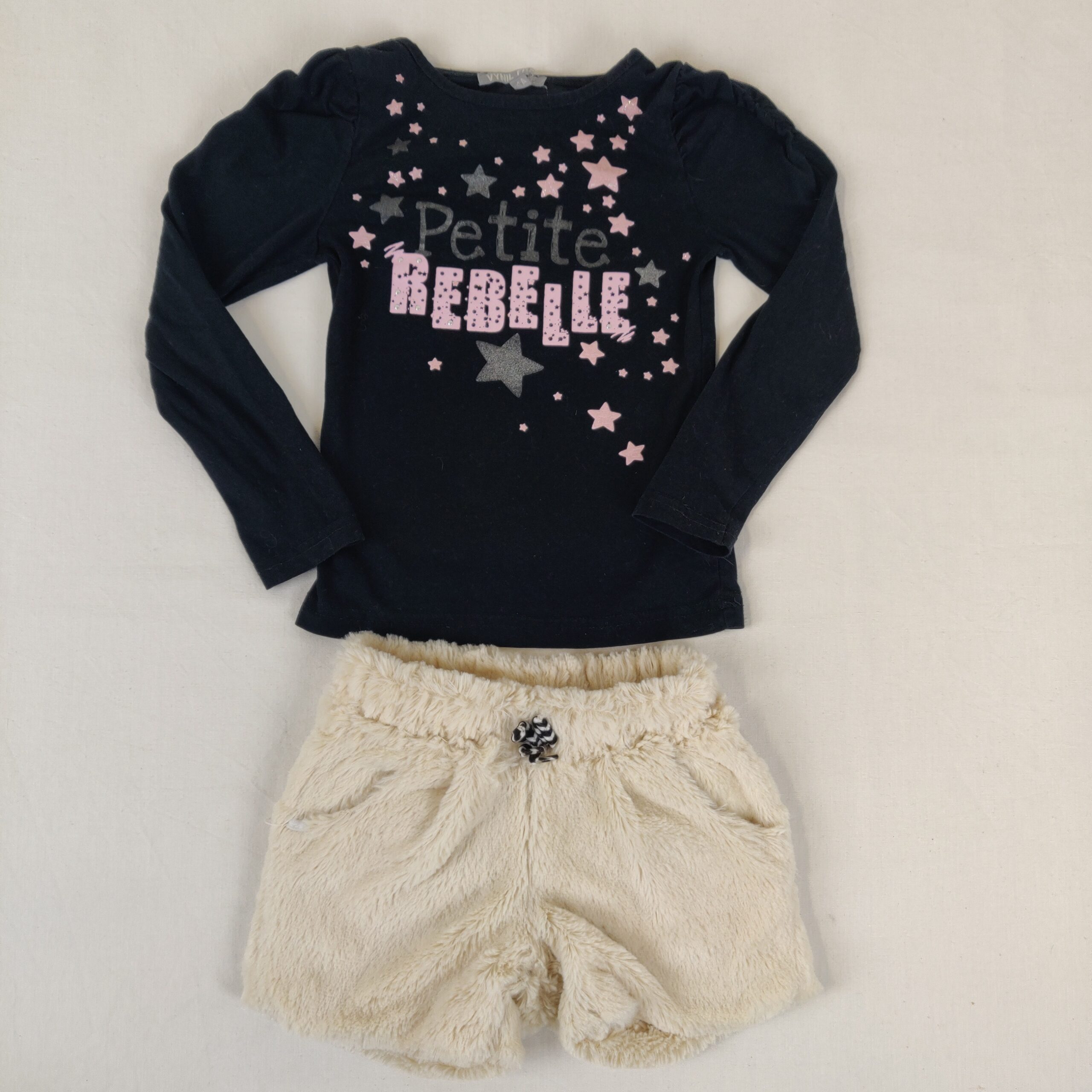 Autres commentaires : Ensemble 2 pièces. Un t-shirt à manches longues Vinyl Fraise – noir. Motifs centraux étoiles roses et argentées accompagnés de l’inscription « Petite rebelle ». Petit trou central reprisé. Un short Kiabi en fourrure synthétique beige. Taille élastique. 2 poches latérales et 2 poches arrières. Niveau réduit de fraise à myrtille.