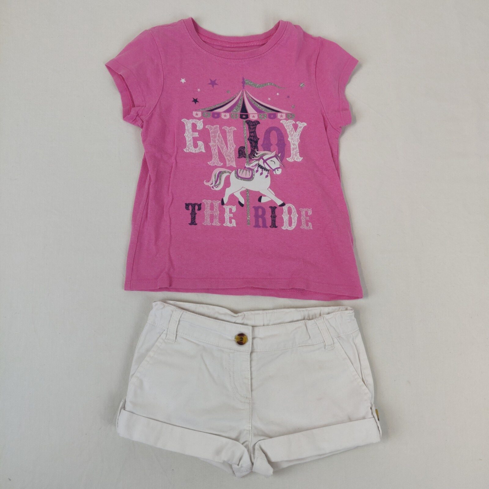 Autres commentaires : Ensemble 2 pièces. Un t-shirt à manches courtes 725Originals -rose. Motif central manège de chevaux accompagné de l’inscription « Enjoy the ride ». Usure normale. Un short sans marque – blanc. Taille ajustable. 2 poches latérales et 2 poches arrières. Passants pour une ceinture.