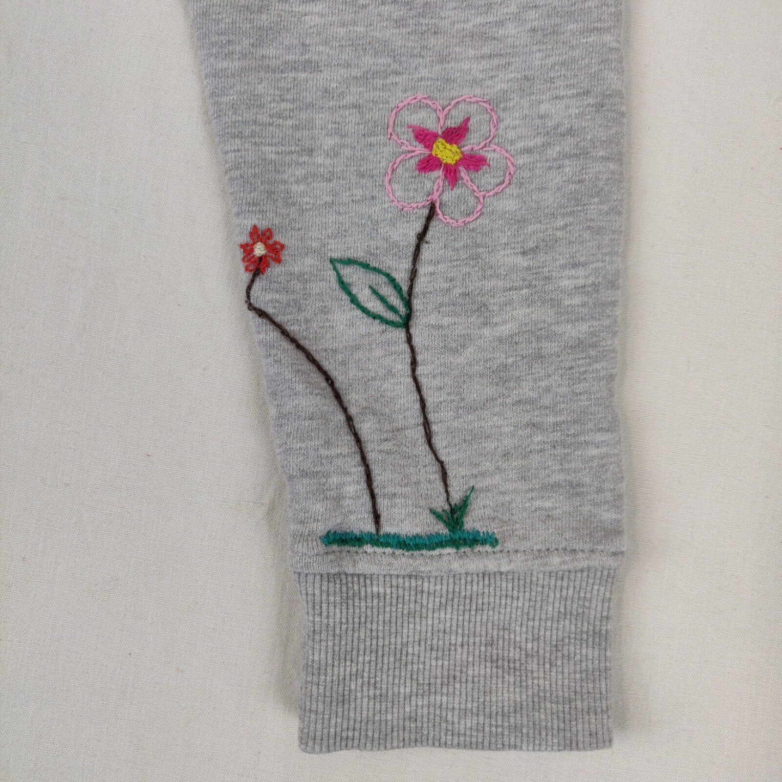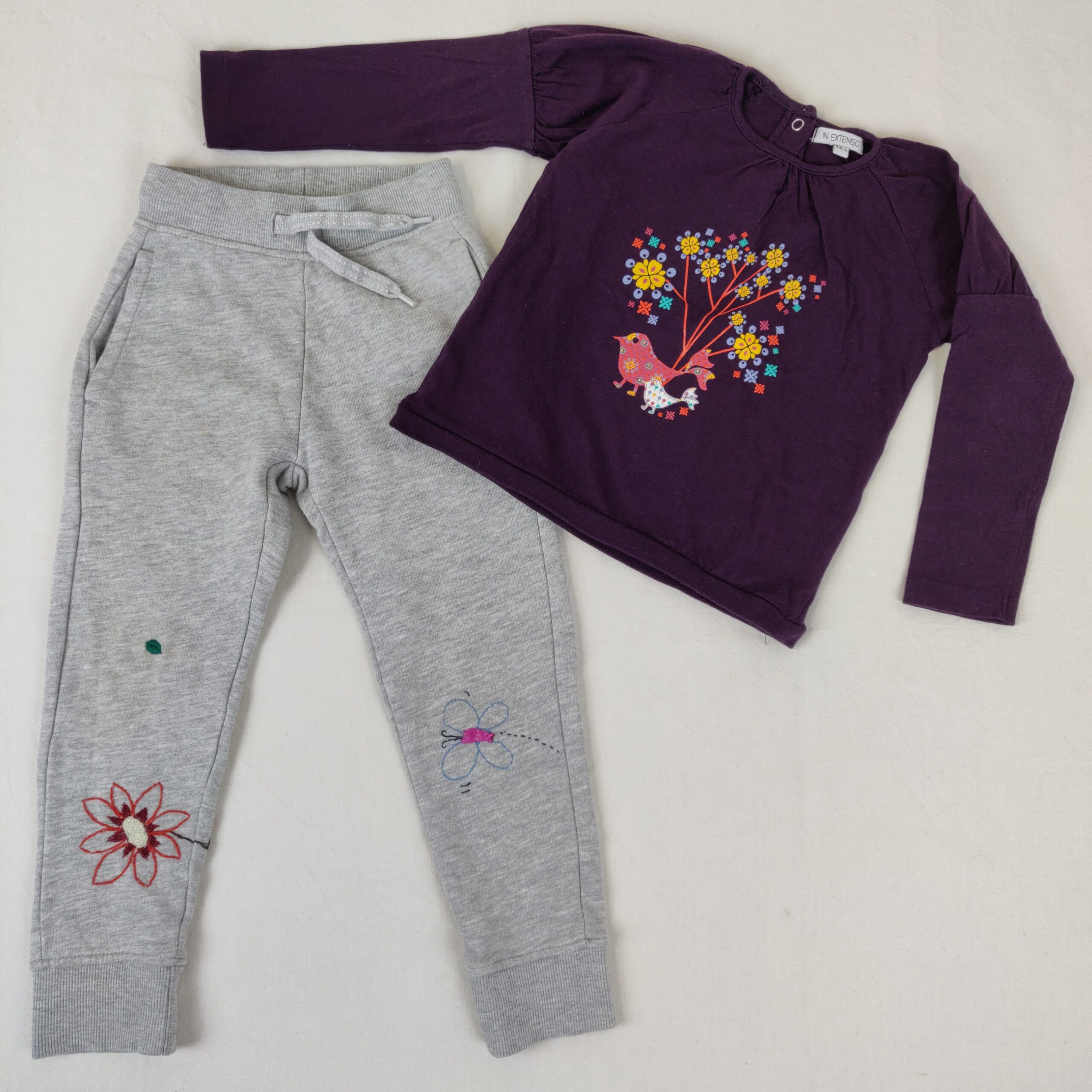 Autres commentaires : Ensemble 2 pièces. Un t-shirt à manches longues In extenso – violet. Motifs centraux deux oiseaux à l’abri d’un arbre. Ouverture centrale au dos à 3 pressions. Un jogging Kiabi – gris chiné. Motifs brodés champêtres dans le bas (customisation). Une tâche marron discrète. Taille élastique avec cordon interne gris. 2 poches latérales.