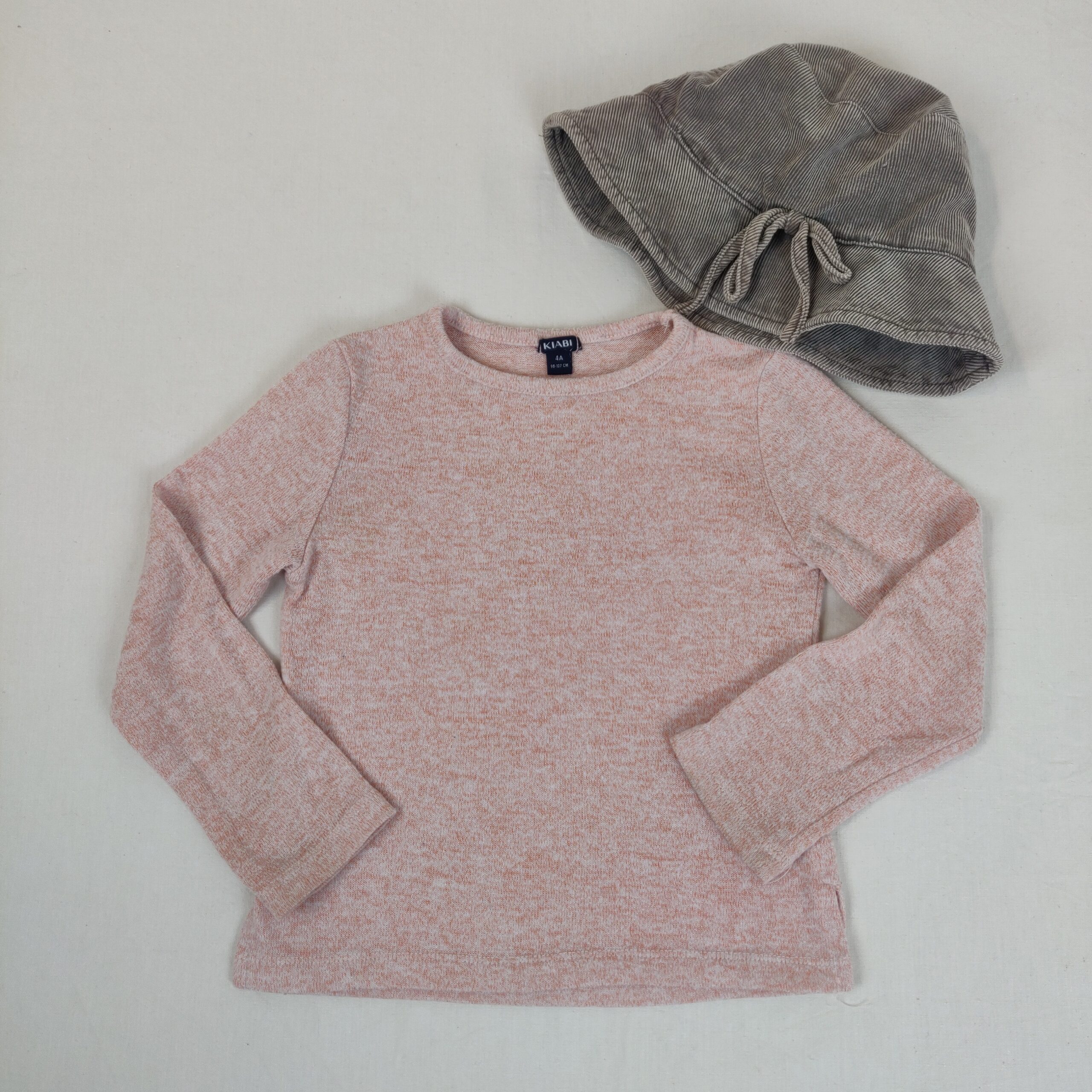 Autres commentaires : Ensemble 2 pièces. Un t-shirt à manches longues Kiabi rose chiné. Un chapeau Okaïdi en velours côtelé – marron. Noeud central.