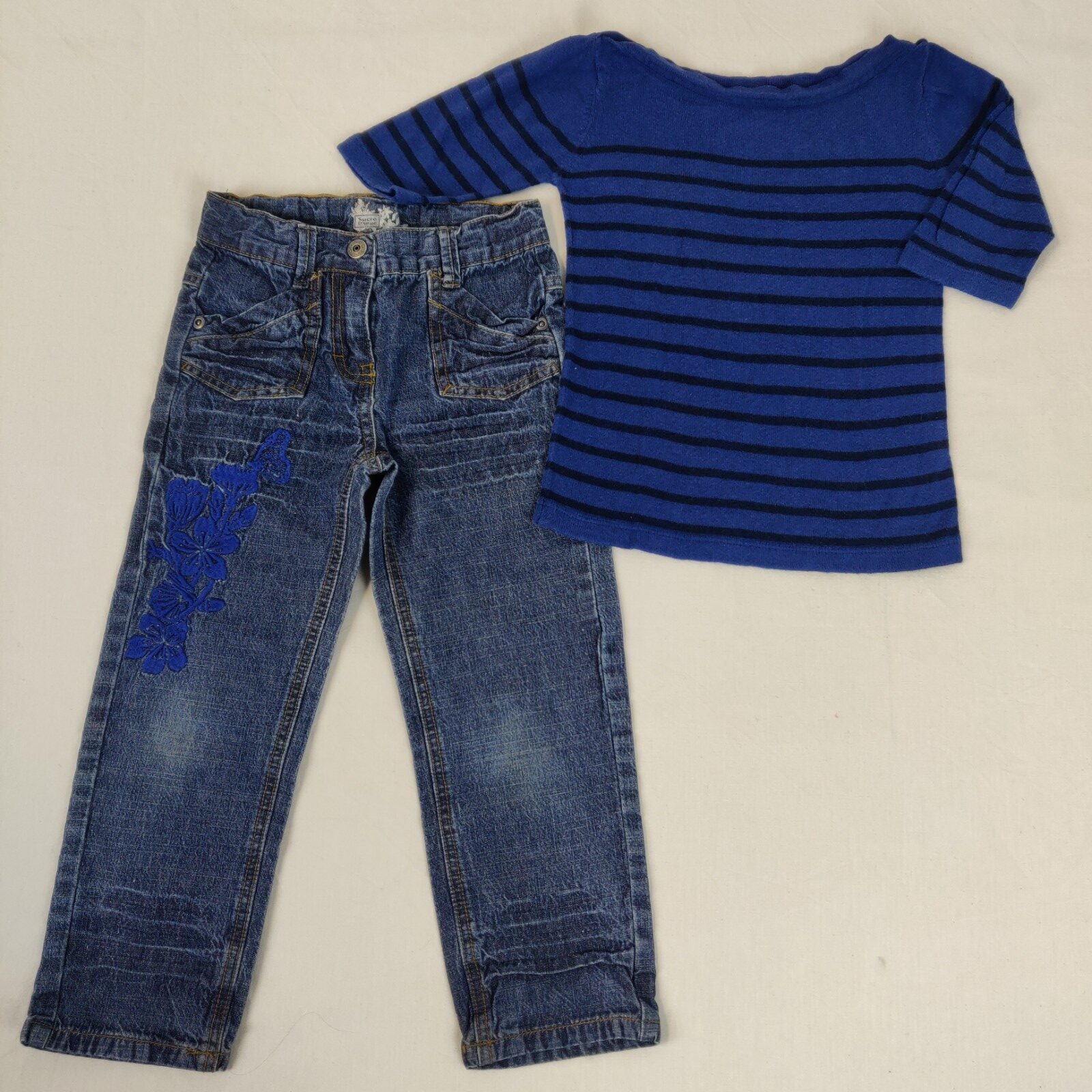 Autres commentaires : Ensemble 2 pièces. Un pull C.F.K à manches 3/4 en fines mailles – bleu à rayures horizontales bleu marine. Col bateau. Un jean Sucre d’Orge – bleu avec un motif latéral bleu brodé floral. Taille ajustable. 2 poches latérales et 2 poches arrières.Passants pour une ceinture. Marques d’usure au niveau des genoux et une tâche de décoloration à la jambe arrière droite. Niveau réduit de kiwi à fraise.