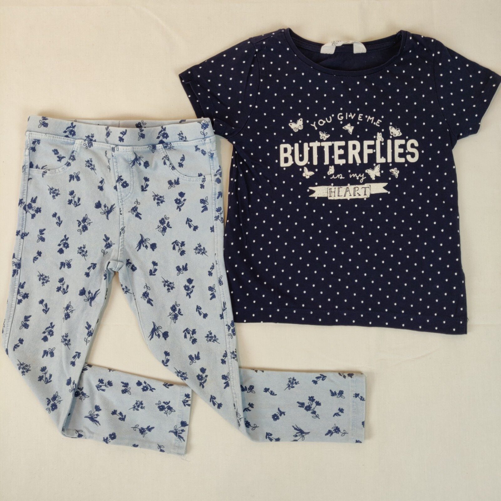 Autres commentaires : T-shirt manches courtes H&M – bleu marine à pois blancs avec motifs papillons et inscription « You give me butterflies in my heart ». Legging Zara Baby – bleu ciel avec motifs fleurs bleu marine en rappel de couleur du t-shirt – taille élastique. 2 poches arrières.
