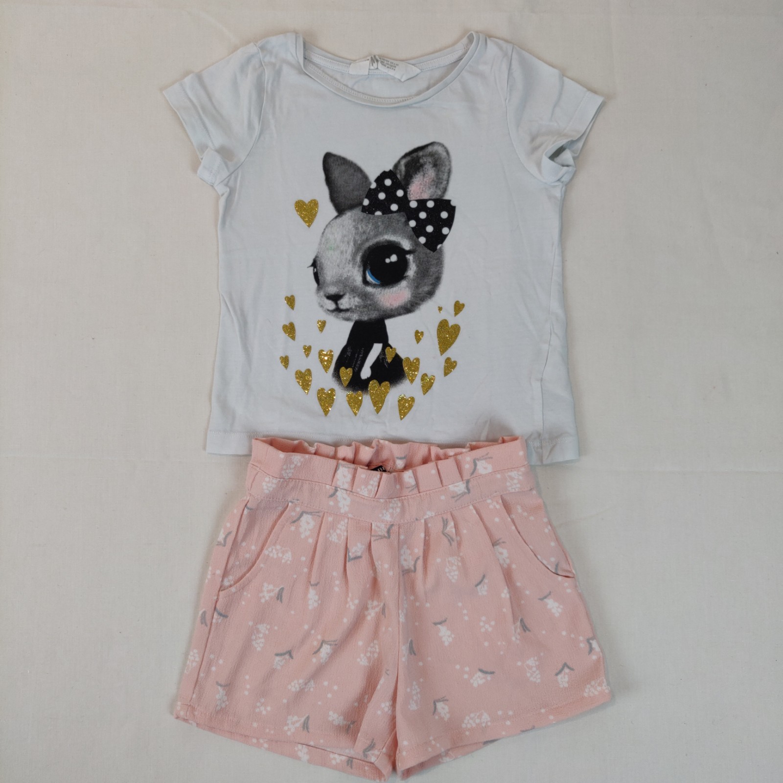 Autres commentaires : T-shirt H&M manches courtes – écru motifs lapine coquette et coeurs pailletés dorés. Short Kiabi – rose avec motifs floraux blancs et gris – taille élastique. 2 poches latérales et 2 poches arrières.