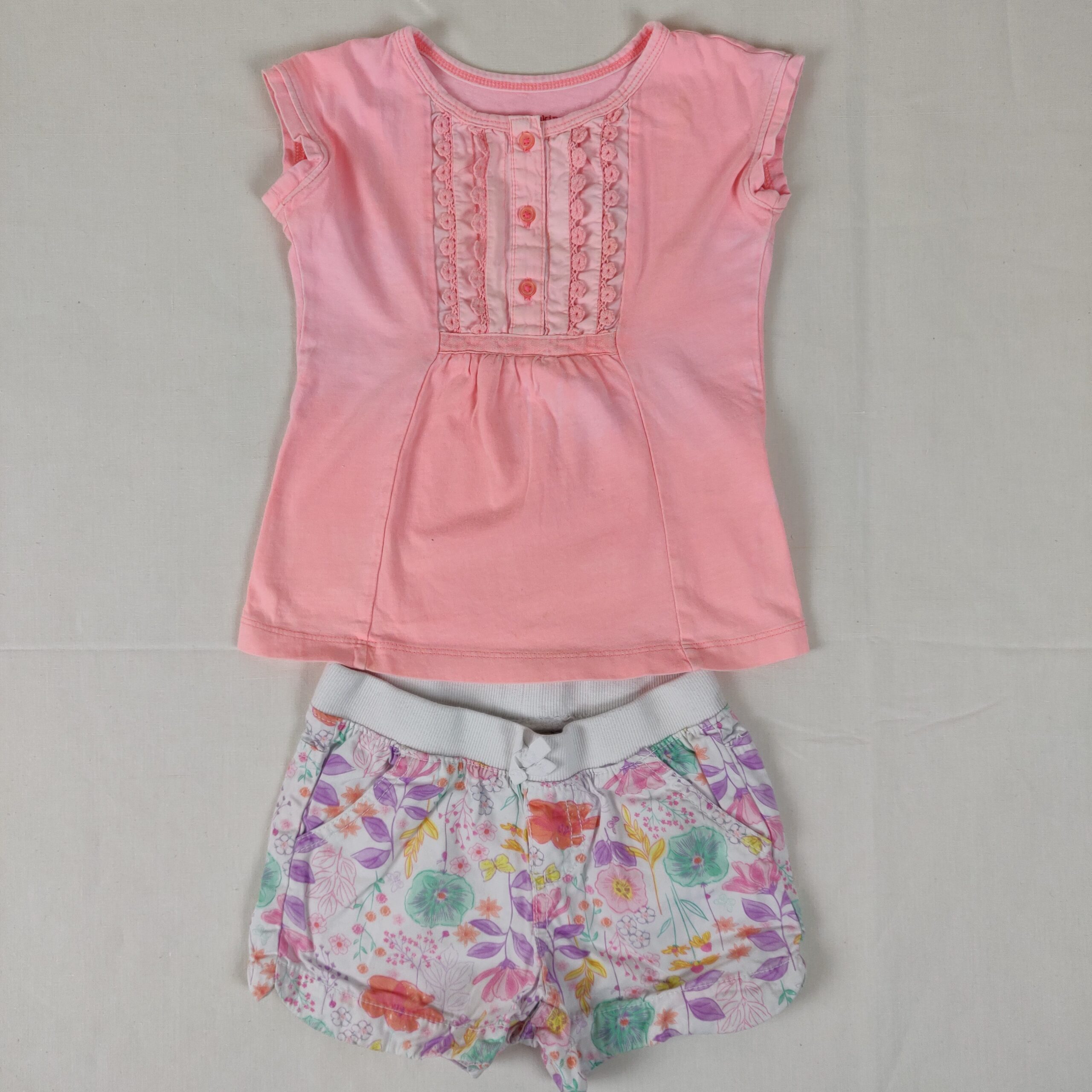 Autres commentaires : Short blanc de marque Cherokee avec fleurs et papillons multicolores oranges, roses, violettes, jaunes et vertes, taille élastiquée blanche – Haut sans manches de marque Toughskins couleur rose saumon, boutonnée devant en haut, effet plastron (étiquette en polyester 100% recyclé)