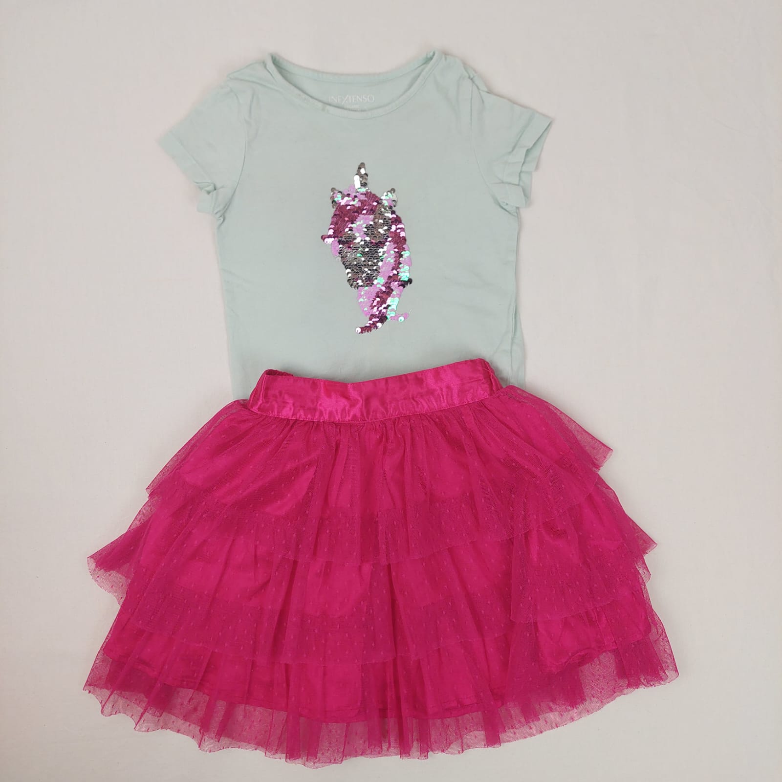 Autres commentaires : T-shirt manches courtes In Extenso turquoise, licorne en sequins, jupe à volants superposés rose effet dentelle, doublure polyester 100%
