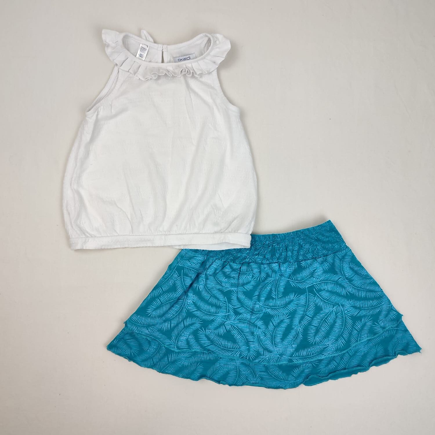 Autres commentaires : Ensemble 2 pièces dont 1 jupe légère U Collection, à volants surperposés en jersey 100% coton, de couleur vert canard à motifs feuillages bleu lavande, taille à large élastique et un haut sans manches Okaïdi, style débardeur blanc avec frise légèrement ajouré, col à collerette, fermeture par bouton en haut du dos, resserré et froncé en bas.