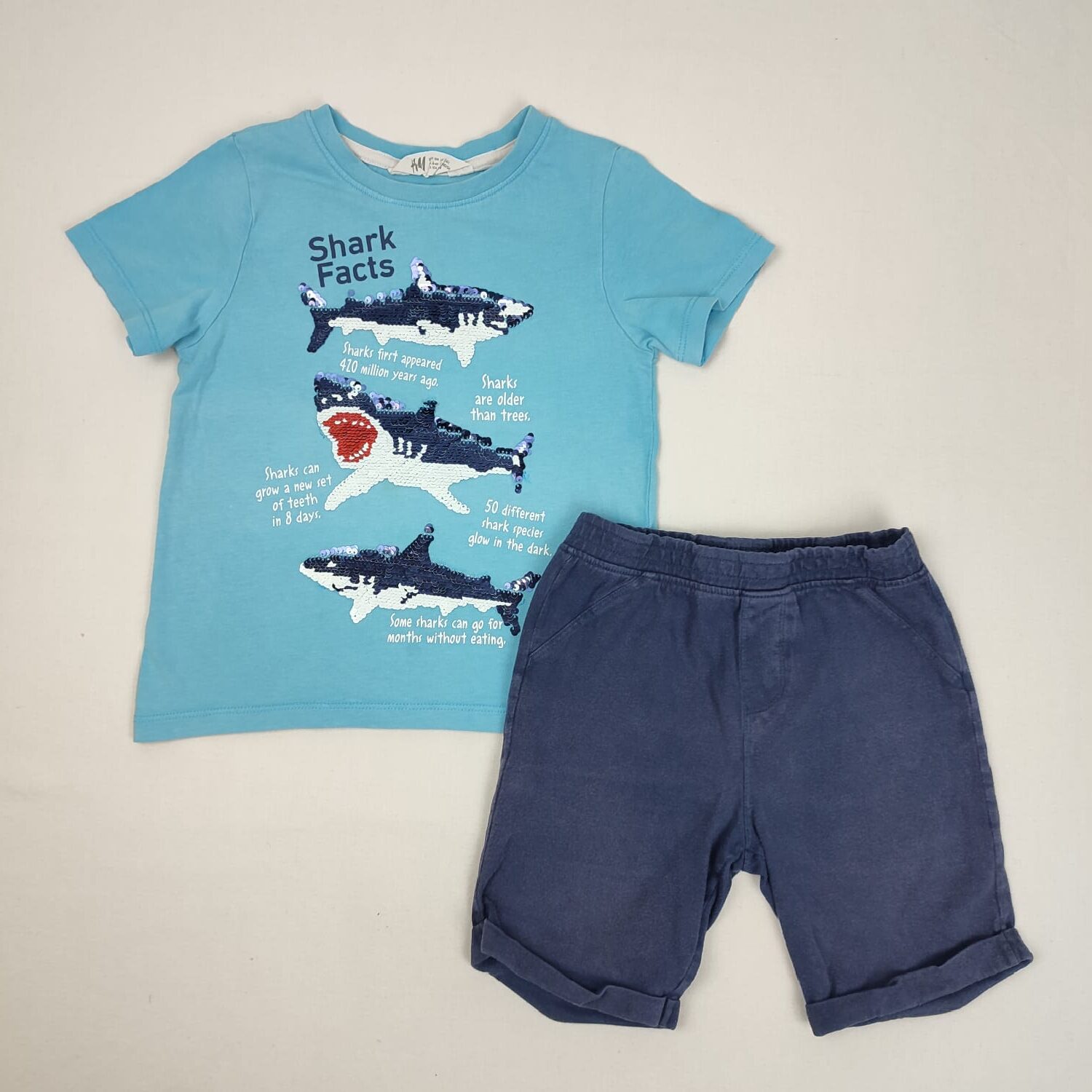 Autres commentaires : Ensemble 2 pièces : T-shrit H&M manches courtes bleu clair, col rond, motifs 3 requins en sequins et short Tex en jersey bleu foncé, revers au niveau des jambes, taille élastiquée (coutures un peu marquées par le temps). Baissé de Fraise à Myrtille