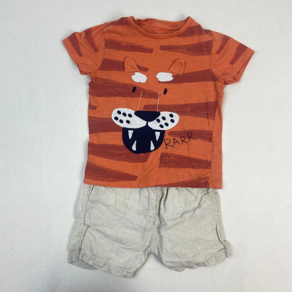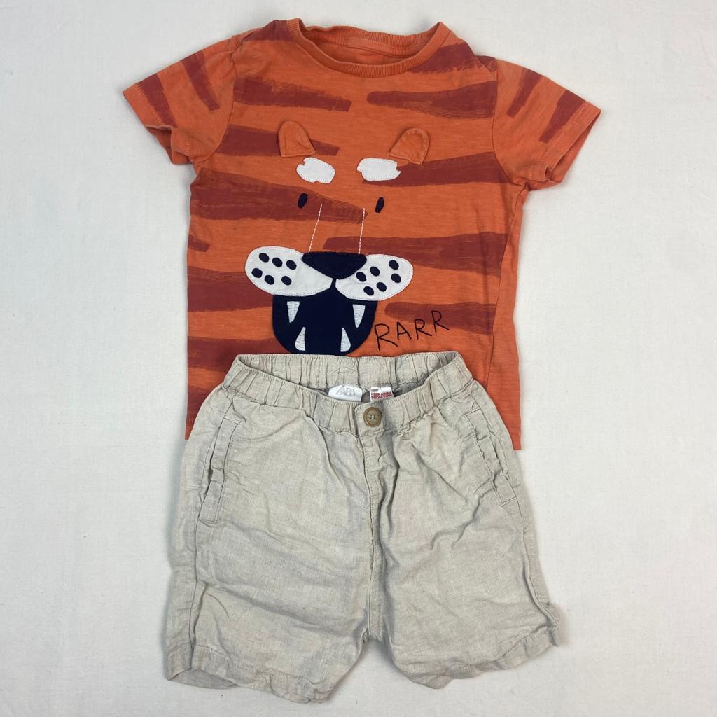 Autres commentaires : Ensemble de 2 pièces : Short beige ZARA en lin 100%, taille élastique, fermeture par bouton classique. T-shirt orange M&S manches courtes à motif tête de tigre.