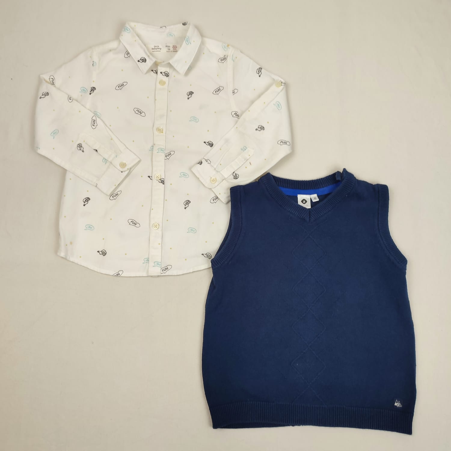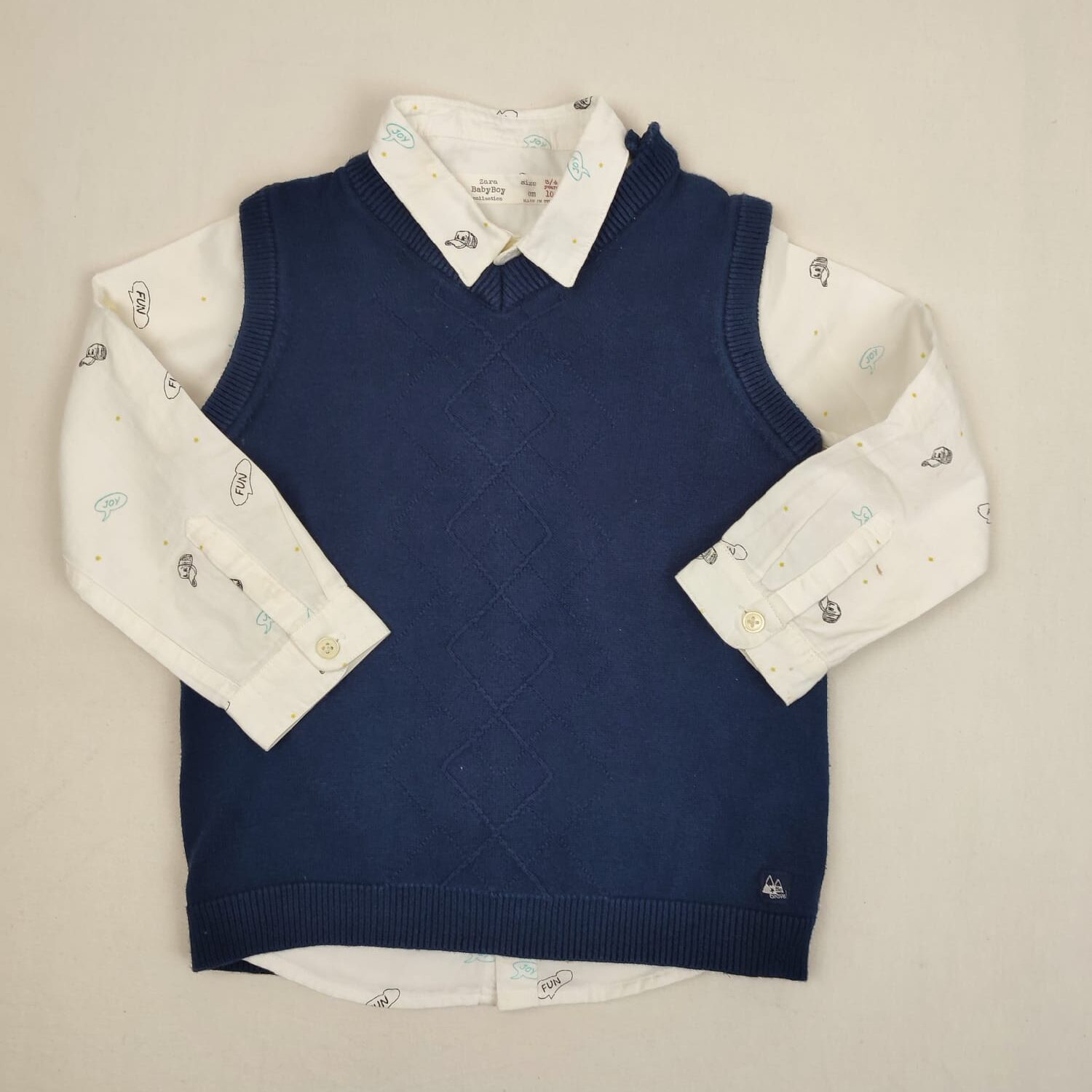 Autres commentaires : Ensemble 2 pièces : – Chemise manches longues blanche ZARA BabyBoy, à motif casquettes et bulles avec les inscriptions « FUN », « JOY », 100% coton. – Pull fin sans manches en maille bleu foncé Z, à motif losanges ton-sur-ton, col V, fermeture par boutons à l’épaule gauche.