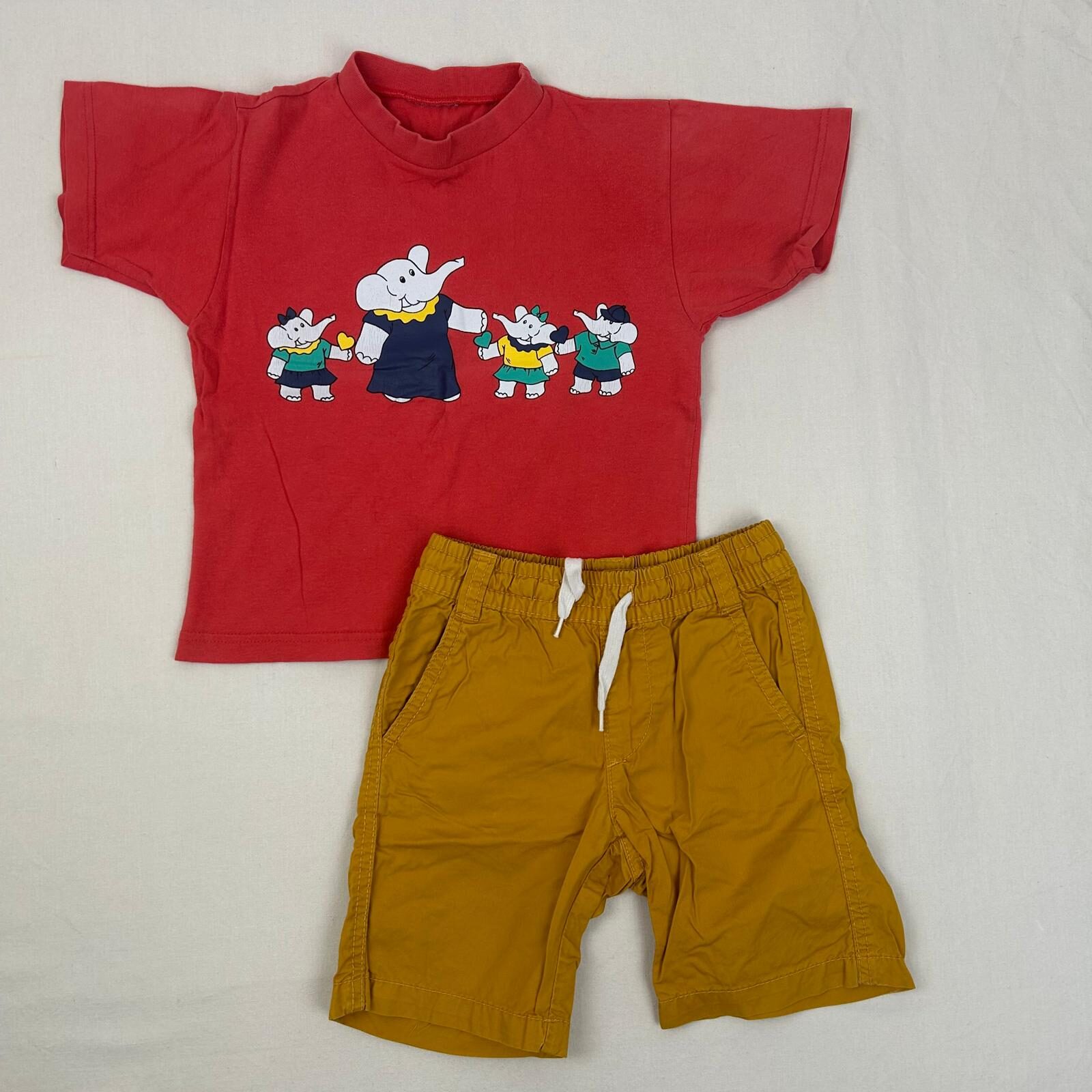 Autres commentaires : Ensemble 2 pièces : – Un T-shirt manches courtes rose, avec une illustration baba à l’avant – un bermuda jaune Kiabi avec un petit trou rapiécé à l’arrière du vêtement au niveau de la ceinture.