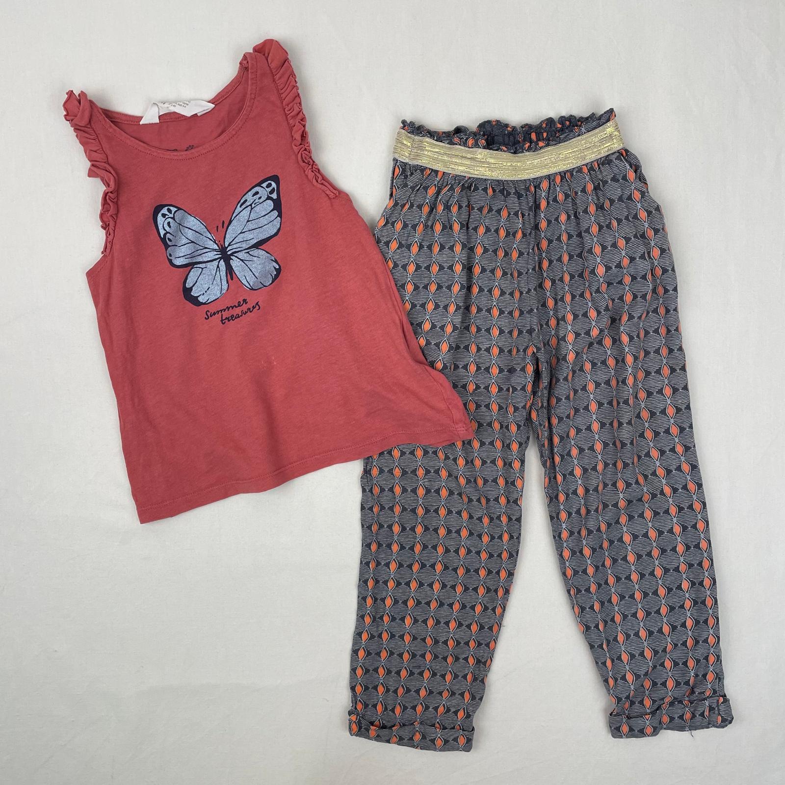 Autres commentaires : Ensemble 2 pièces : -1 débardeur H&M avec un papillon et l’inscription « Summer Treasures » devant, 100% coton ; -1 pantalon Arsène et les pipelettes, taille élastiquée dorée, poches discrètes, imprimé de motifs losanges oranges.