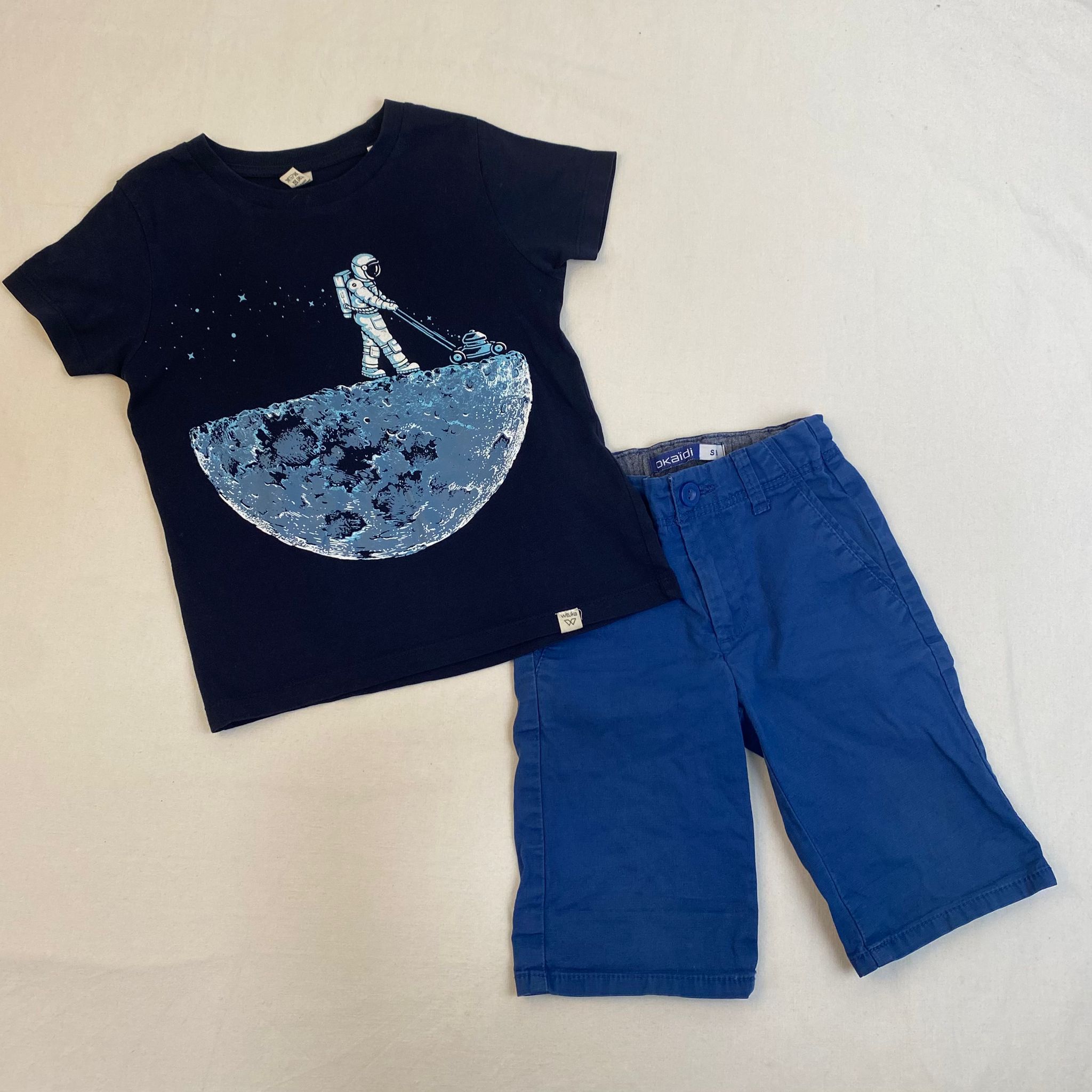 Ensemble 2 pièces : – Bermuda slim en toile bleu roi Okaïdi, fermeture devant par bouton et zip, ceinture ajustable par élastique intérieur, 98% coton et 2% élasthanne. – T-shirt Wituka bleu foncé, devant motif astronaute en train de passer une tondeuse dans l’espace, en 100% coton organique.
