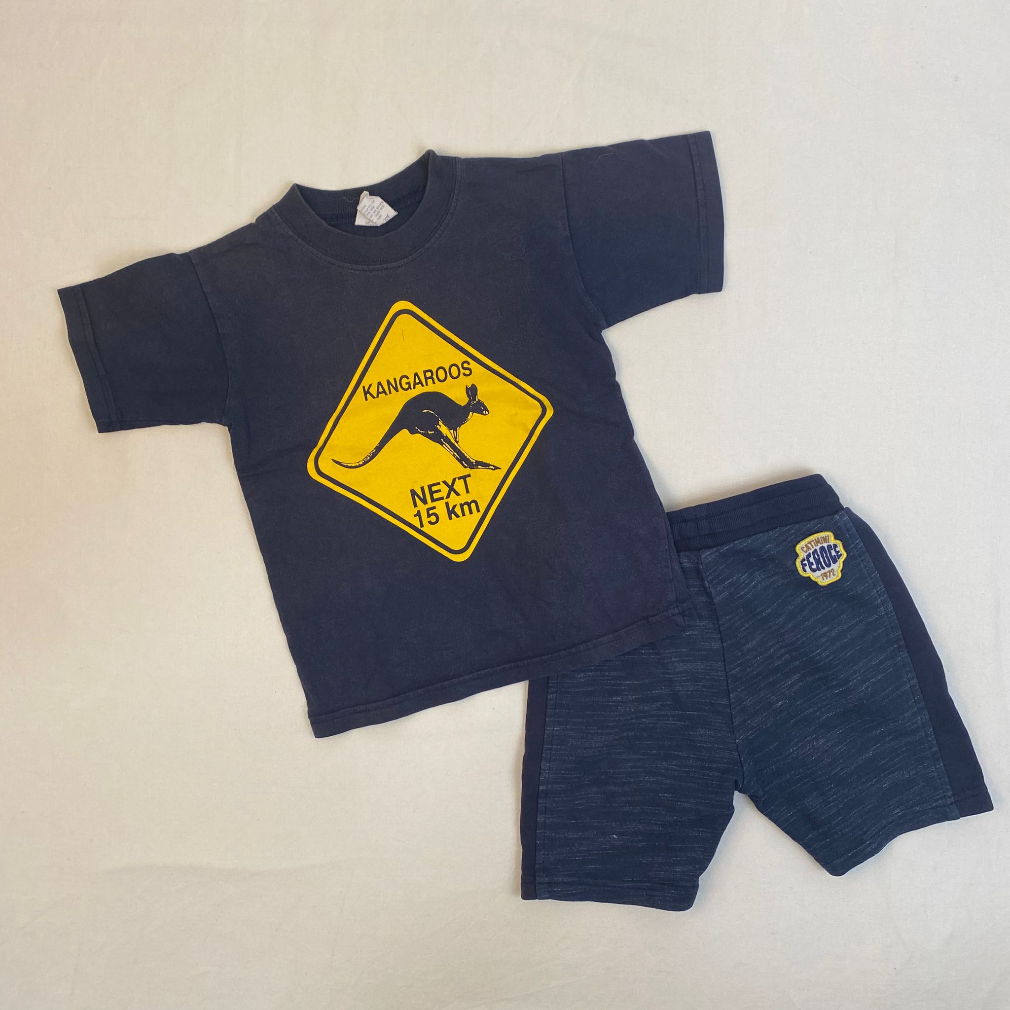 Ensemble 2 pièces : – Short Catimini bleu foncé légèrement strié de beige, taille élastiquée avec lacets bleu électrque aux bouts jaune fluo, écusson à l’arrière jaune et bleu avec inscription « Catimini FEROCE 1972 ». – T-shirt manches courtes bleu foncé, devant panneau de signalisation en forme de losange jaune avec dessin de kangourou et inscriptions « Kangaroos » et « next 15km », 100% coton.