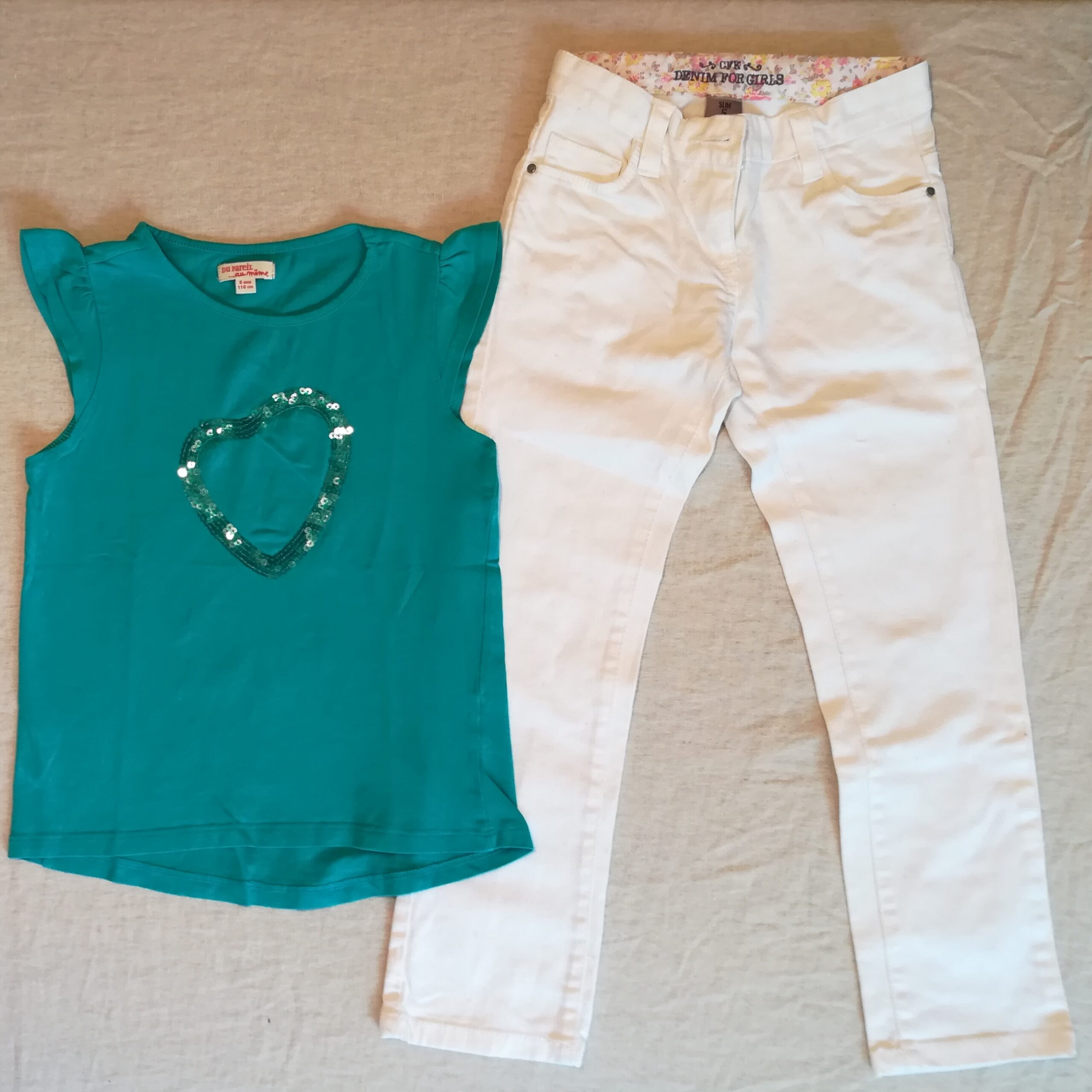 Autres commentaires : T-shirt Du Pareil au Même 100% coton avec sequins, pantalon denim blanc slim CFK 2% élasthanne