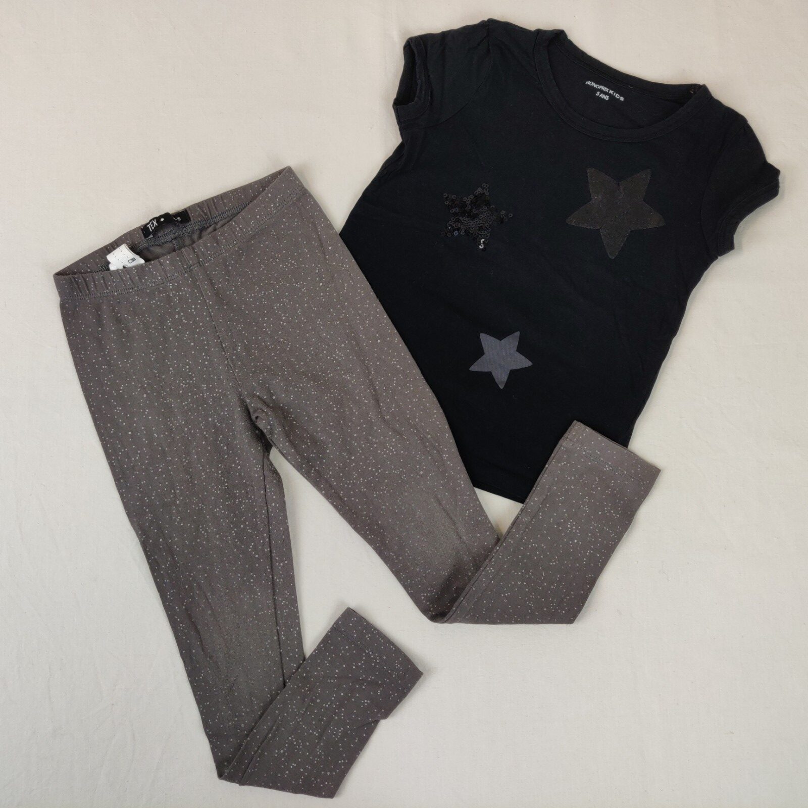 Autres commentaires : T-shirt à manches courtes noir Monoprix Kids avec motifs d’étoiles 100% coton. Legging marron à points blancs avec taille ajustable Tex 95% coton et 5% élasthanne.