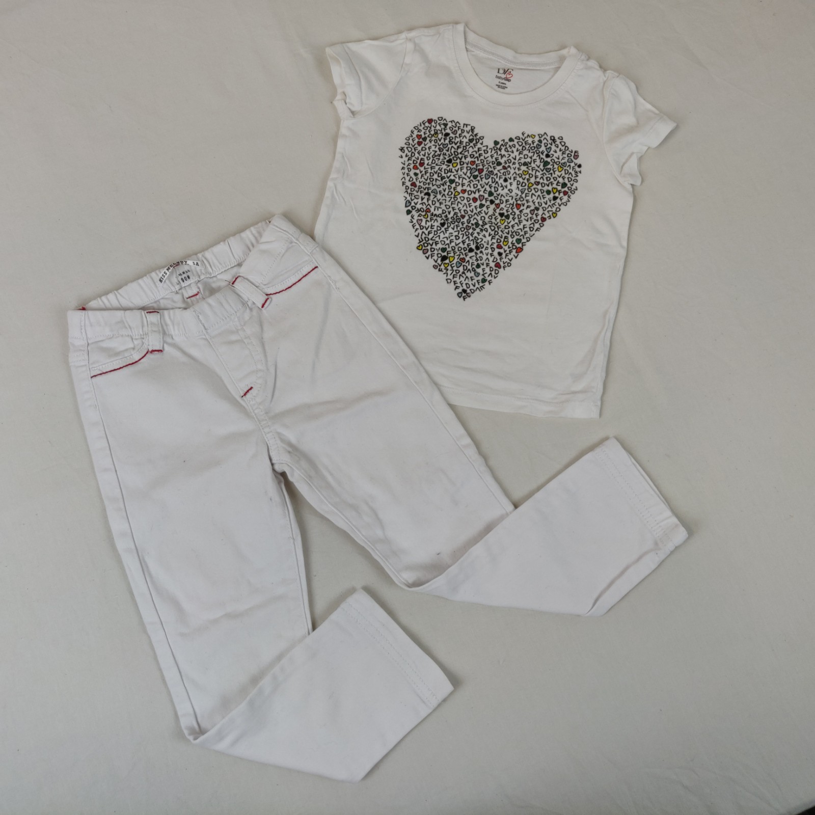 Autres commentaires : T-shirt blanc babyGap avec coeur noir 100% coton. Jean blanc avec taille ajustable Kiss Melody 100% coton