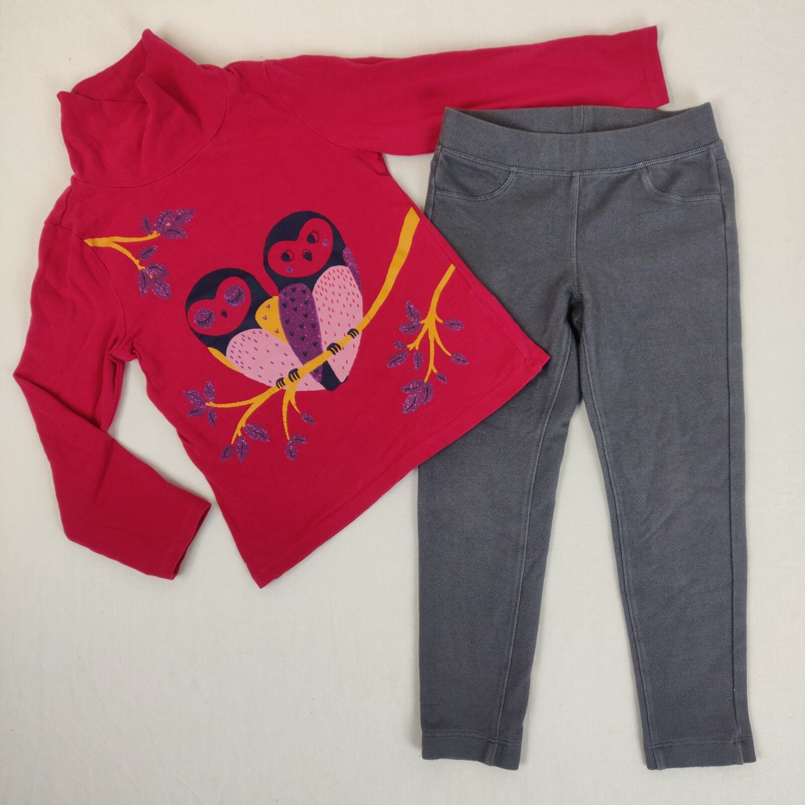 Autres commentaires : Ensemble 2 pièces. Un t-shirt à manches longues et à col roulé Du Pareil au même – fushia avec motifs multicolores et pailletés hiboux. Un jegging Tex – gris chiné. Taille élastique. 2 poches arrières.