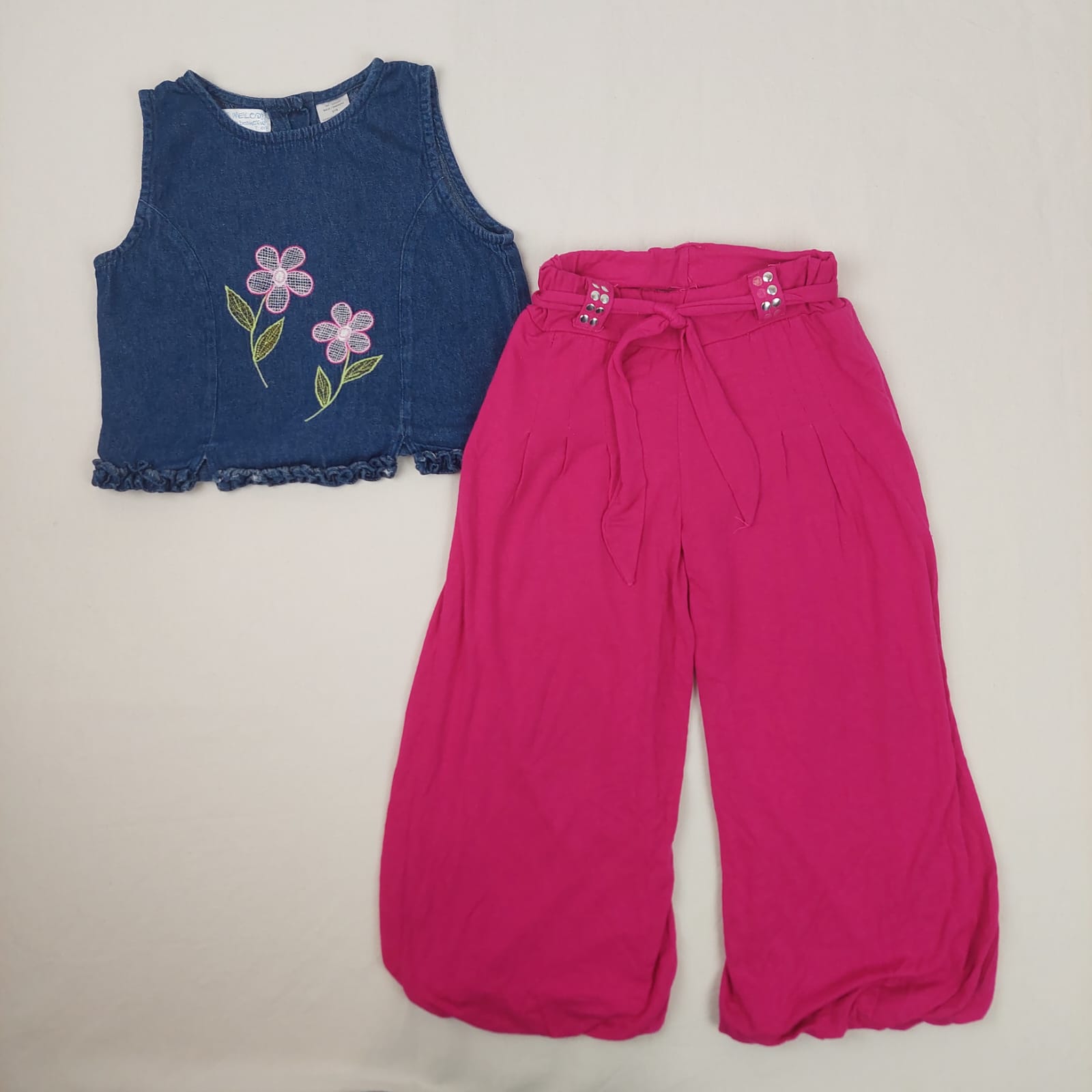 Autres commentaires : T-shirt sans manches Kiss Melody en jean bleu, fleurs brodés, boutoné dans le dos, pantalon rose esprit sarouel, ceinture en tissu