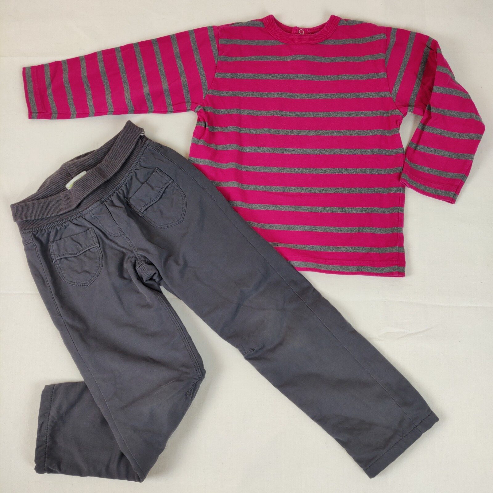 Autres commentaires : Ensemble 2 pièces. T-shirt à manches longues « Today » – fuchsia avec de fines rayures gris chiné. Ouverture centrale au dos à un bouton pression. Pantalon « Vertbaudet » doublé en polaire – marron glacé. Taille façon tricot élastique et ajustable. 2 poches avant et 2 poches arrières avec un coeur cousu.