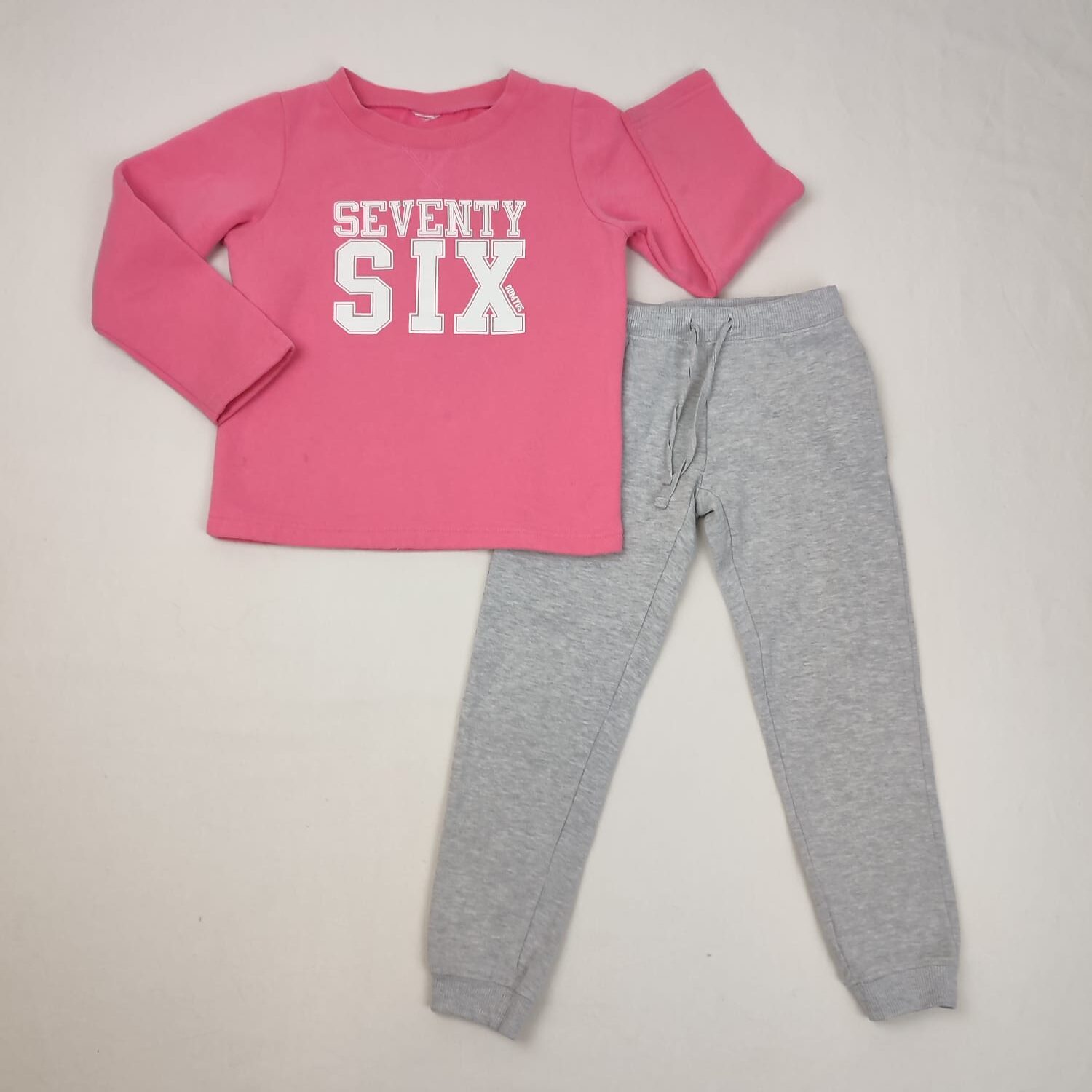 Autres commentaires : Sweat rose Decathlon, inscription » 76″ à l’avant, petites tâches en bas à droite qui devraient partir au lavage. Pantalon de jogging gris Young Dimension, taille élastique avec lacets, très bon état.