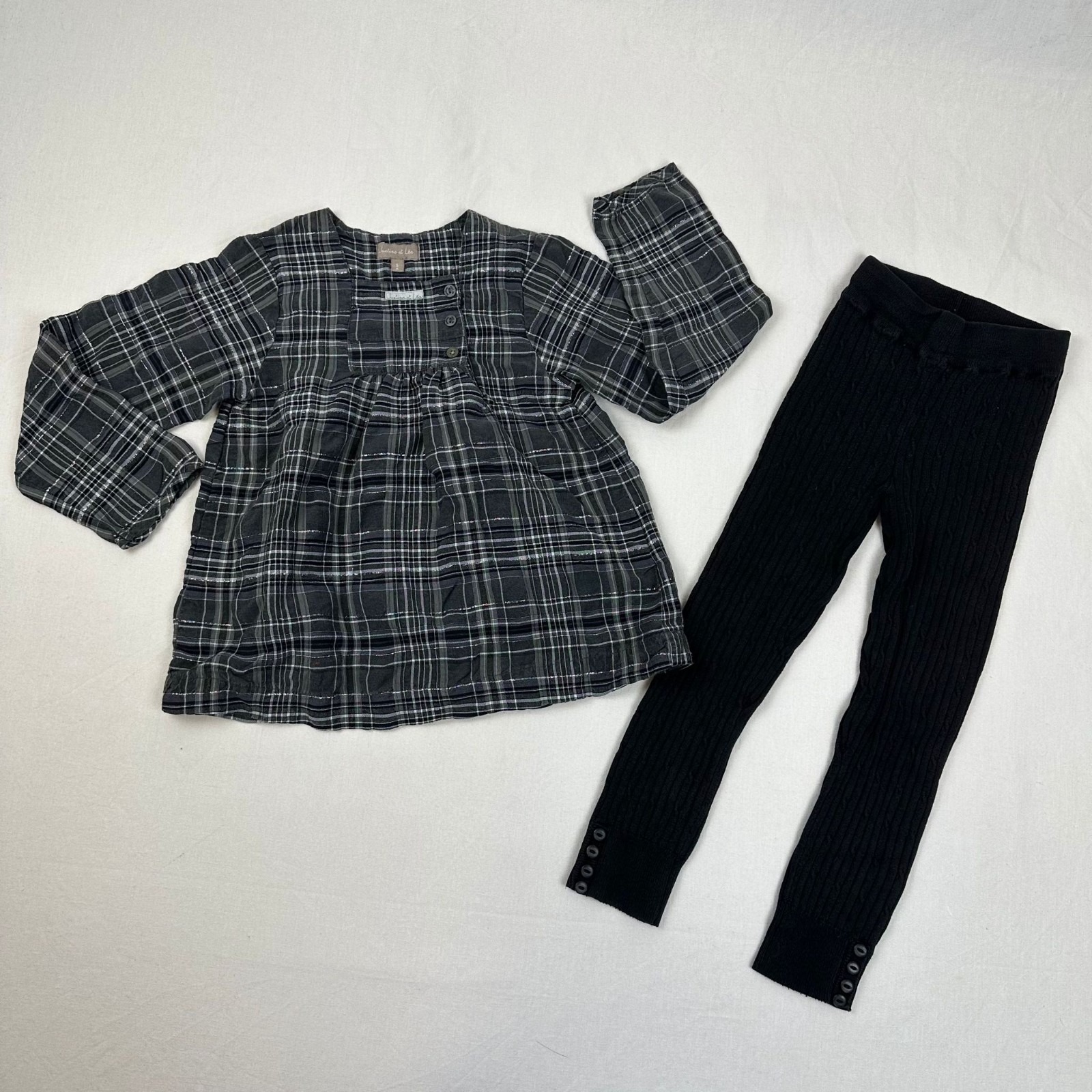Autres commentaires : Blouse manches longues Justine et léa gris en écossais, col carré et une fermeture devant par boutons. Legging H&M noir avec taille élastiquée.