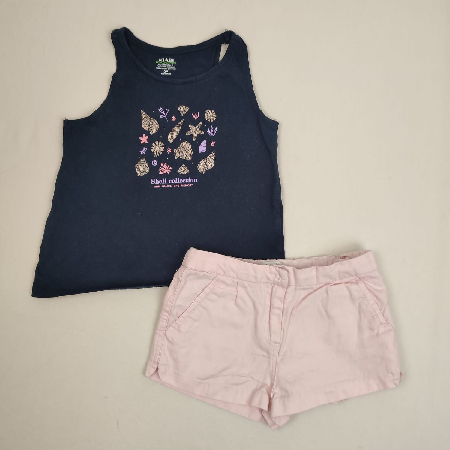 Autres commentaires : Ensemble 2 pièces : – T-shirt sans manches bleu nuit KIABI, motif coquillages dorés, roses et mauves. – Short en toile rose très pâle Vertbaudet, fermeture par zip et crochet métallique, coton 67% et lin 33%.