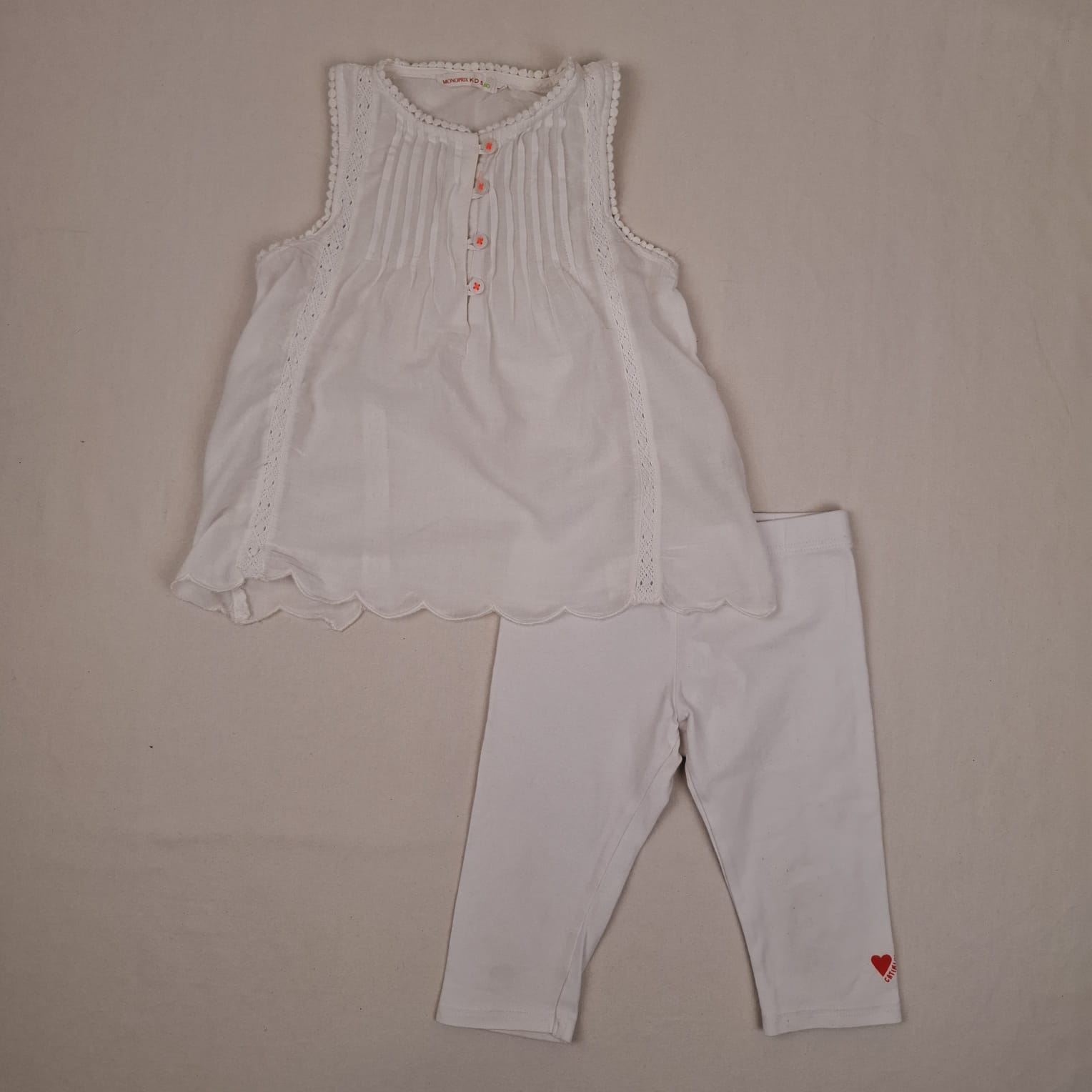 Autres commentaires : Ensemble 2 pièces: Blouse blanches MONOPRIX KIDS en voile sans manches, broderies devant et dos, col tunisien. -Leggings blancs CATIMINI, taille élastique, 6% élasthanne.