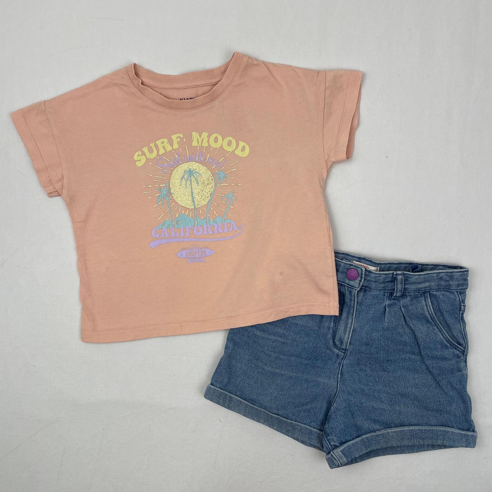 Autres commentaires : Ensemble 2 pièces : -1 tee-shirt Kiabi rose saumon avec devant un imprimé « Surf mood », « Surf with me ! », « California » et un dessinde montagnes, palmiers et soleil, en jaune, violet et vert ; -1 short DPAM en jean bleu avec elastiques reglables à la ceinture, des ourlets, un bouton violet à la braguette, des poches.