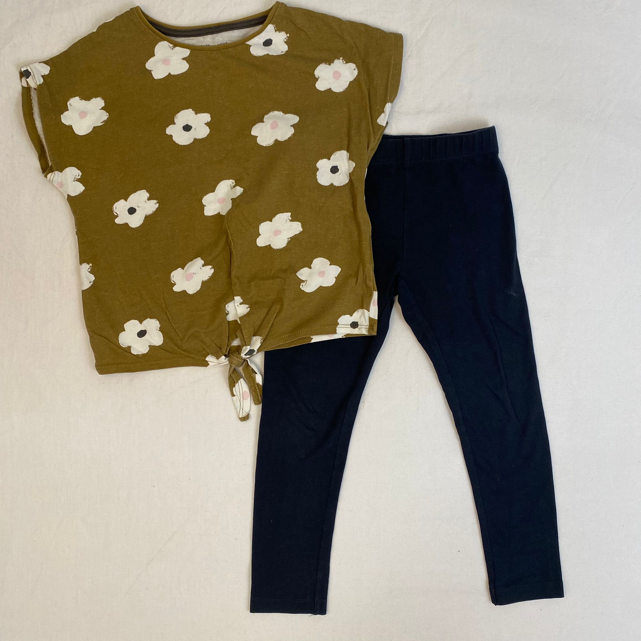 Ensemble 2 pièces 5A composés d’un haut manches courtes col rond vertbaudet vert kaki avec motifs fleur avec lacet de serrage à la taille façon crop top et d’un bas noir long taille élastiquée DPAM