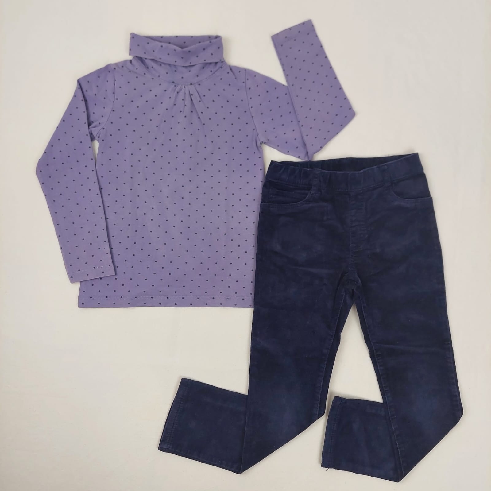 Autres commentaires : T-shirt manches longues col roulé, violet motifs pointnoir, tache de décoloration bleu discrète au niveau du col, 4% élasthanne, pantalon violet, exterieur velour, 2% élasthanne