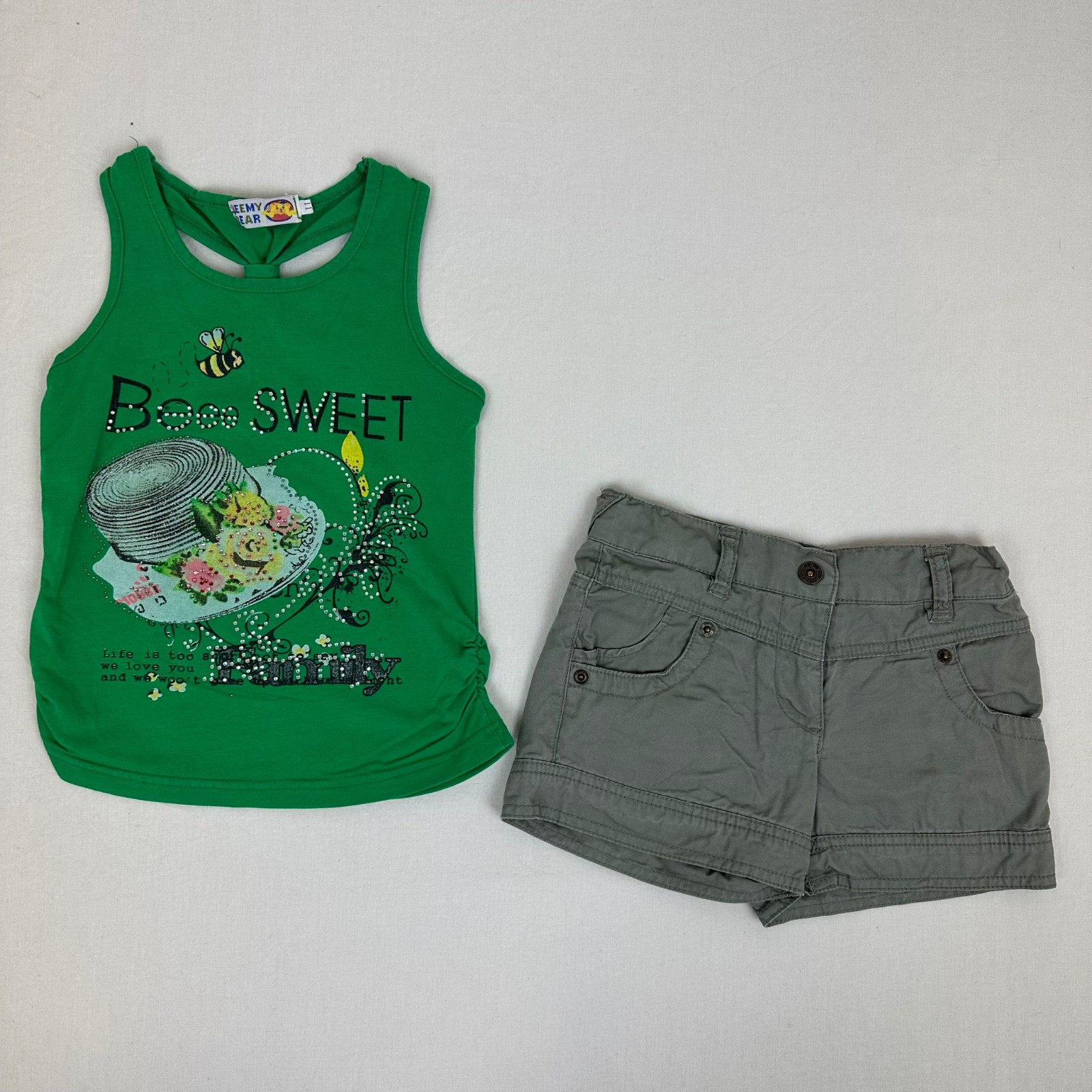 Autres commentaires : Short vert Verbaudet avec taille élastiquée et ceinturée.T-shirt vert Jeemy Bear sans manches avec motif Bee Sweat.