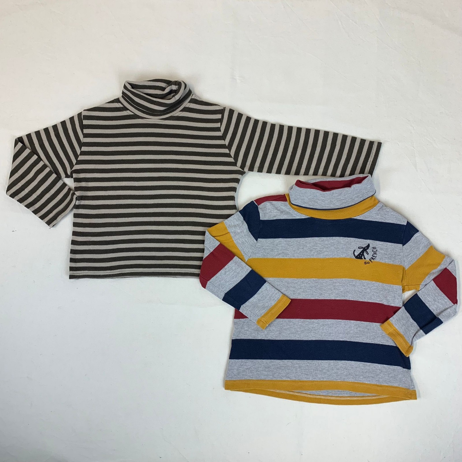 Autres commentaires : T-shirt gris manches longues Du Pareil au Même ,col roulé, rayures jaunes,rouges,bleu. T-shirt beige manches longues GKids avec des rayures fines marron.