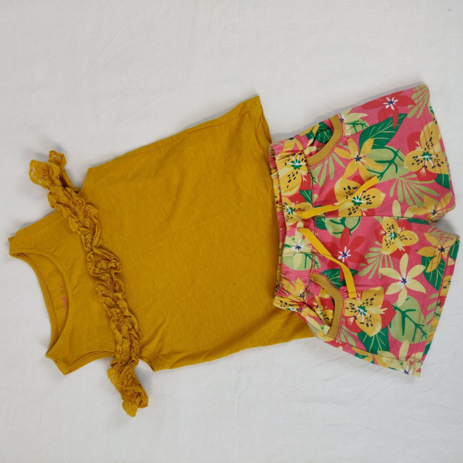 Autres commentaires : 23% polyamide. Ensemble 2 pièces. Un débardeur Gemo -jaune-ocre. La partie centrale est décorée d’un bandeau en relief de fleurs. Short sans marque – rose à motifs floraux mutlicolores. Taille élastique avec cordon interne jaune. 2 poches latérales.