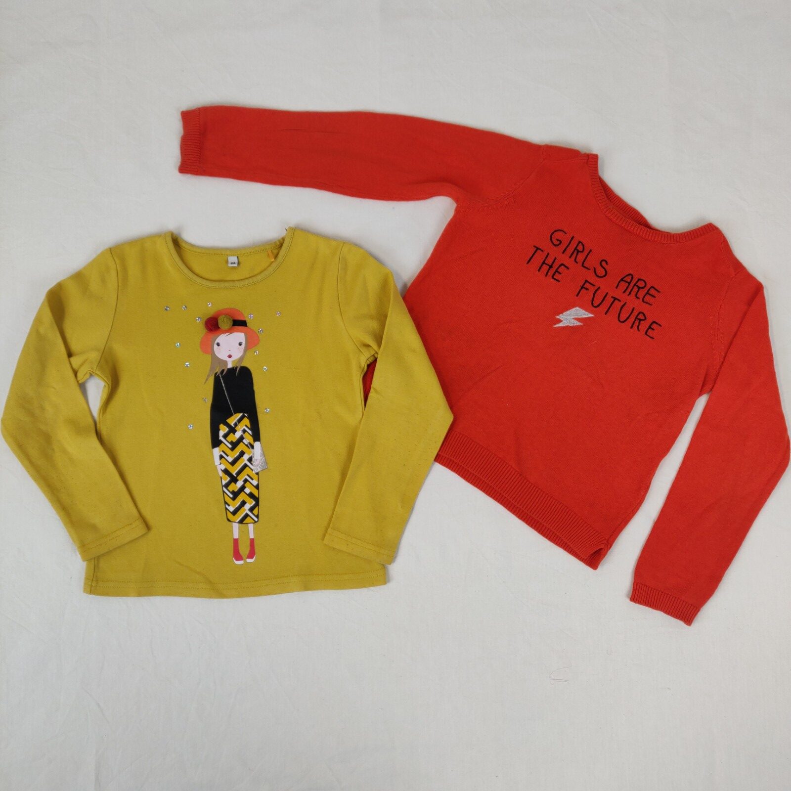 Autres commentaires : 42% polyester. Ensemble 2 pièces. T-shirt à manches longues sans marque – jaune avec motif multicolore jeune fille coquette. Usure normale liée à la matière. Pull en fines mailles Kiabi – orange avec incription centrale noire « Girls are the future » accompagnée d’un éclair argenté.