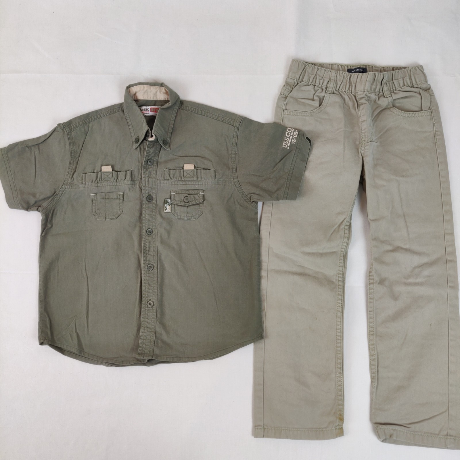 Autres commentaires : Chemise « Basic One » à manches courtes – vert kaki. Ouverture centrale à boutons classiques (2 boutons supplémentaires fournis). 2 pochettes et 2 mini pochettes centrales. Pantalon « In extenso » beige – taille élastique. 2 poches latérales et 2 poches arrières. Légères tâches au niveau des jambes.