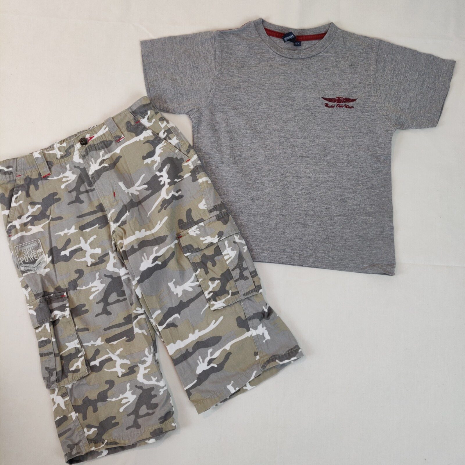 Autres commentaires : 15% viscose. T-shirt Basic One manches courtes – gris chiné. Pantacourt motifs camouflages – ouverture centrale à fermeture éclair et bouton classique. 2 poches latérales, 2 poches à rabat au niveau des genoux et 2 poches à rabat arrières. Passants pour une ceinture.