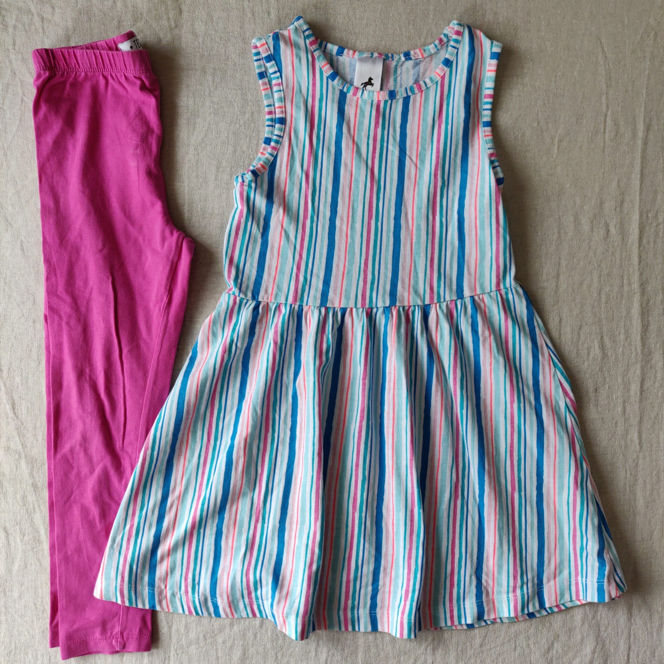 Autres commentaires : Ensemble 2 pièces – leggings rose de marque TEX (5-6 ans) – robe de marque Palomino (122 cm) avec de petites tâches sur le devant dont une de stylo bleu (100% coton)