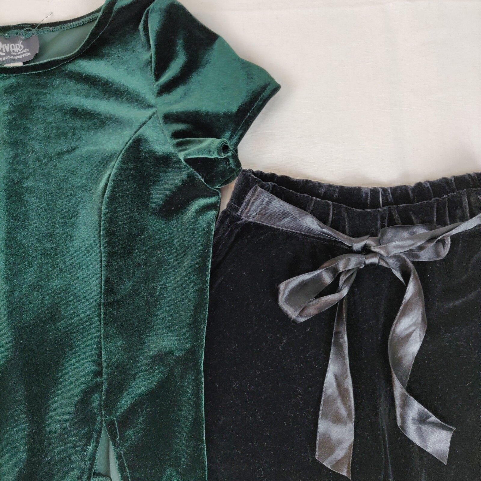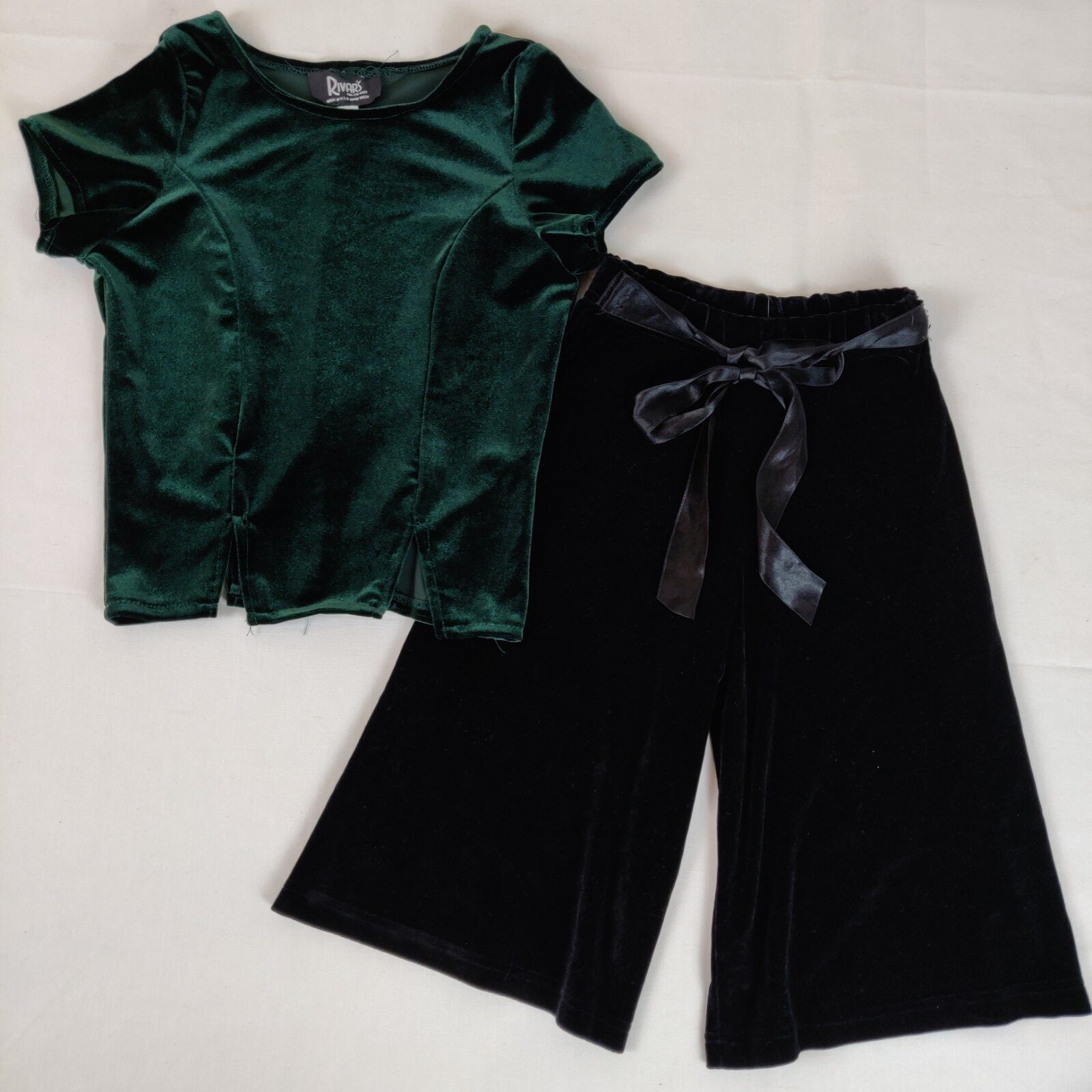 Autres commentaires : 10% spandex. Ensemble 2 pièces satinée pour occasion spéciale. T-shirt à manches courtes « Rivar’s » (taille S) – vert sapin. Taille découpée en 4 V inversés. Jupe culotte « CR Kids » – noir. Taille élastique avec cordon satiné décoratif.